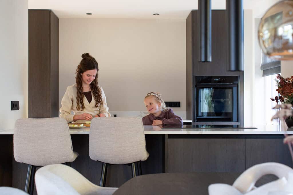 Dankzij de open opstelling staat de keuken van Jacco en Janneke in direct contact met het woongedeelte, waardoor er zichtlijnen en ruimte ontstaan. De dochters van Jacco en Janneke laten in een klein moment precies zien waar de keuken voor bedoeld is; een plek die meebeweegt met het gezin.