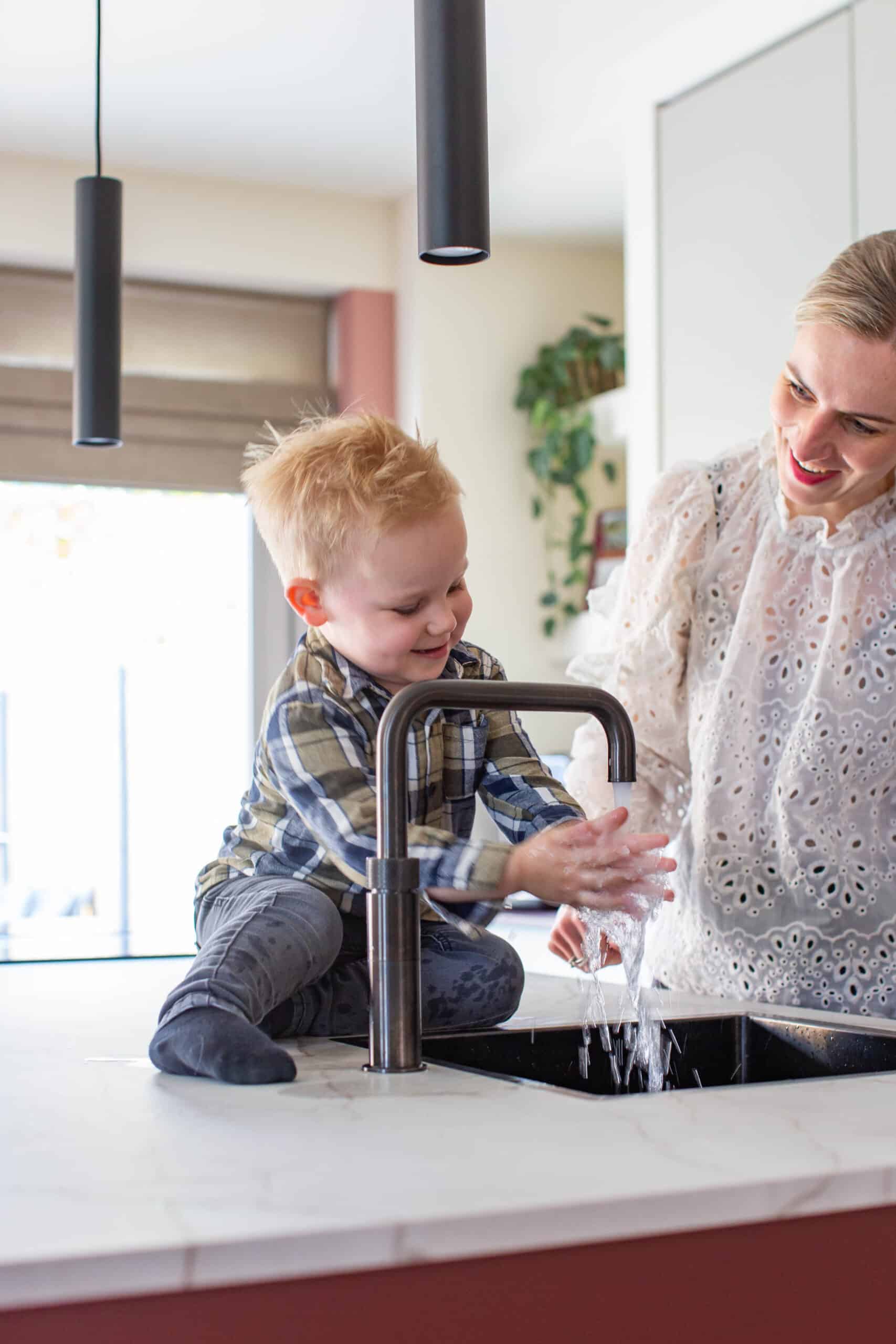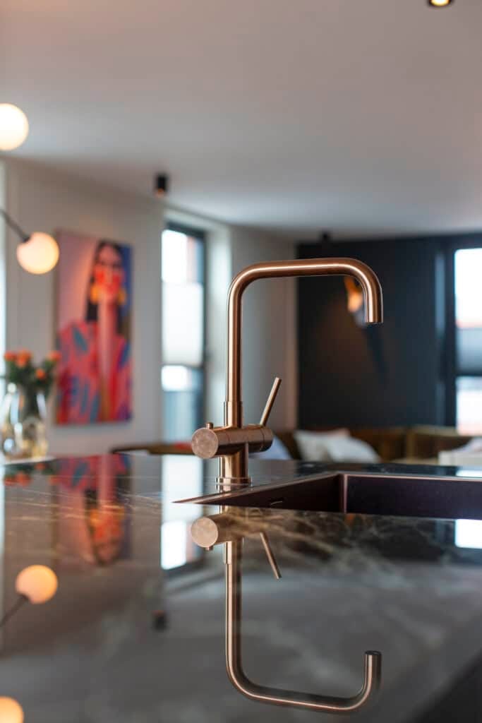 - Kijk naar je interieurstijl – Hou je van Japandi? Dan kan een koperen kraan daar mooi bij passen. Hou je meer van Industrieel? Dan is een RVS of zwarte keukenkraan een beter idee.