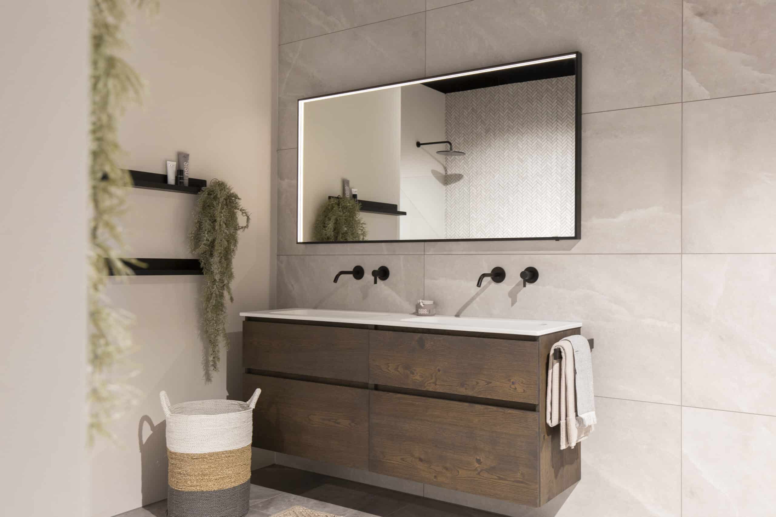 En dan is er natuurlijk nog altijd de mogelijkheid om voor twee spiegels te kiezen, bijvoorbeeld bij een dubbele kraan. Dit zie je terug bij onder andere showroombadkamer Honey.