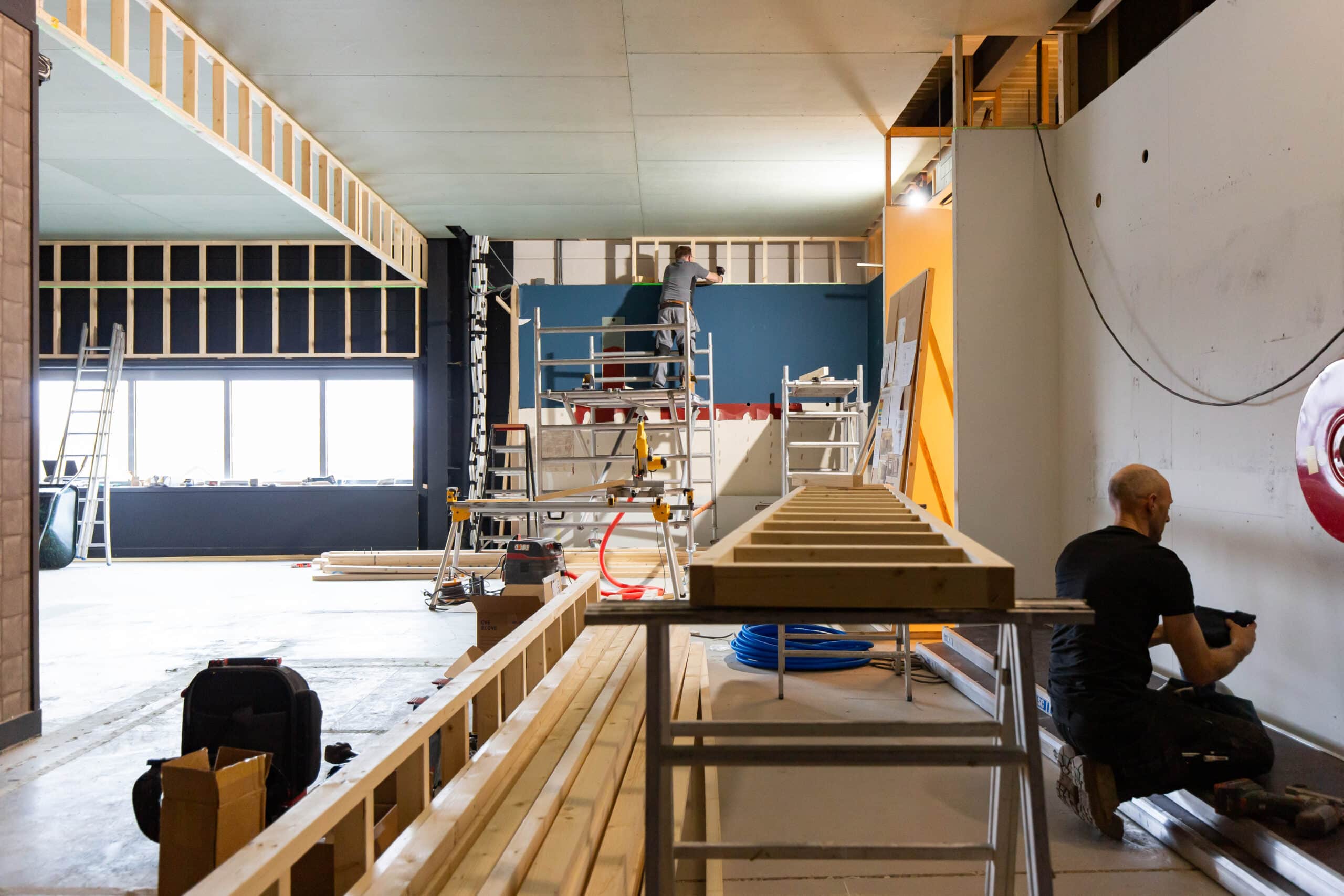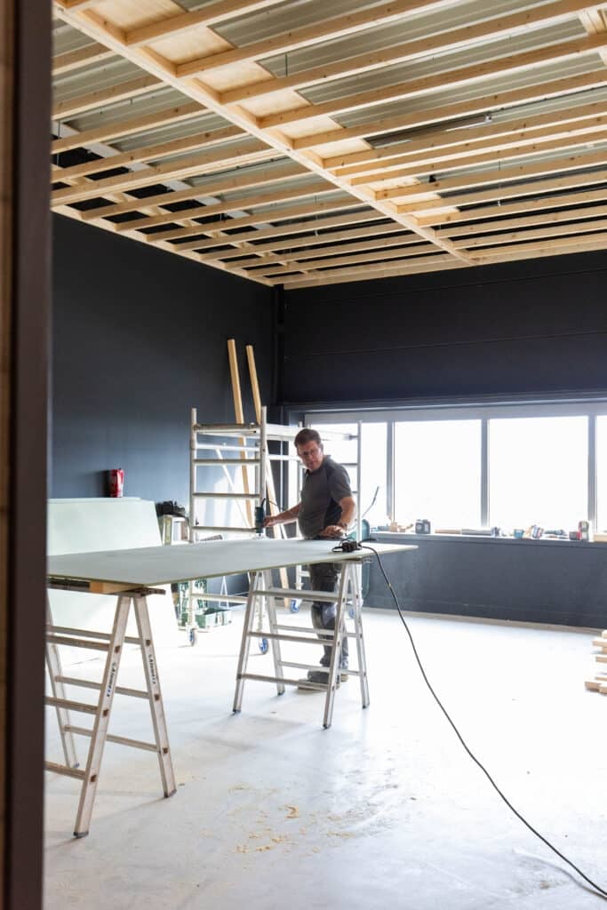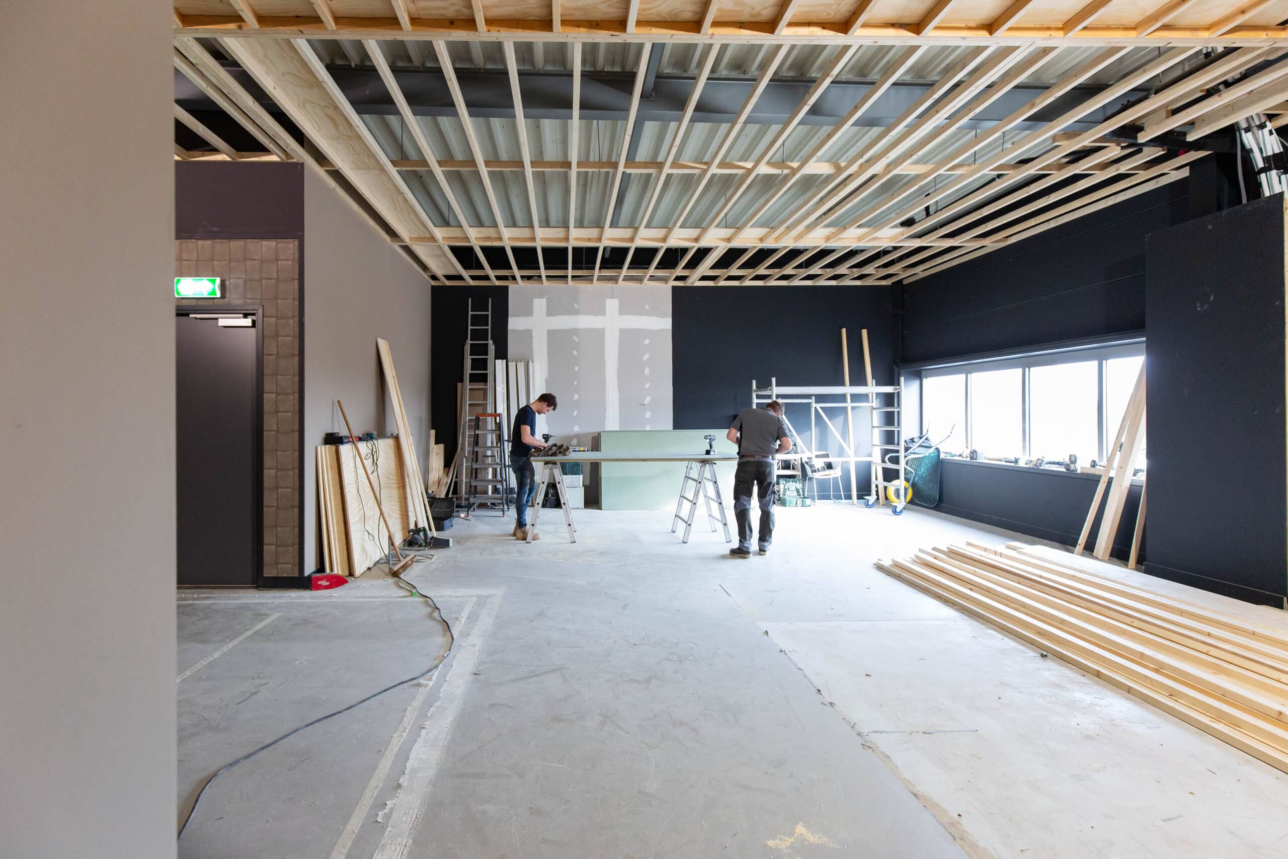 De nieuwe wanden die straks de studio vormgeven, zijn geplaatst. Daarmee zijn de contouren van de ruimte nu écht zichtbaar. Ook het nieuwe plafond zit er inmiddels in, wat meteen zorgt voor een totaal andere uitstraling en niet onbelangrijk: een verbetering van de akoestiek. Zelfs de brandhaspel heeft een nieuwe plek gekregen, zodat alles straks perfect in het ontwerp past. De volgende stap is de ruimte strak maken en schilderen. Wanden en plafond krijgen hun definitieve afwerking.