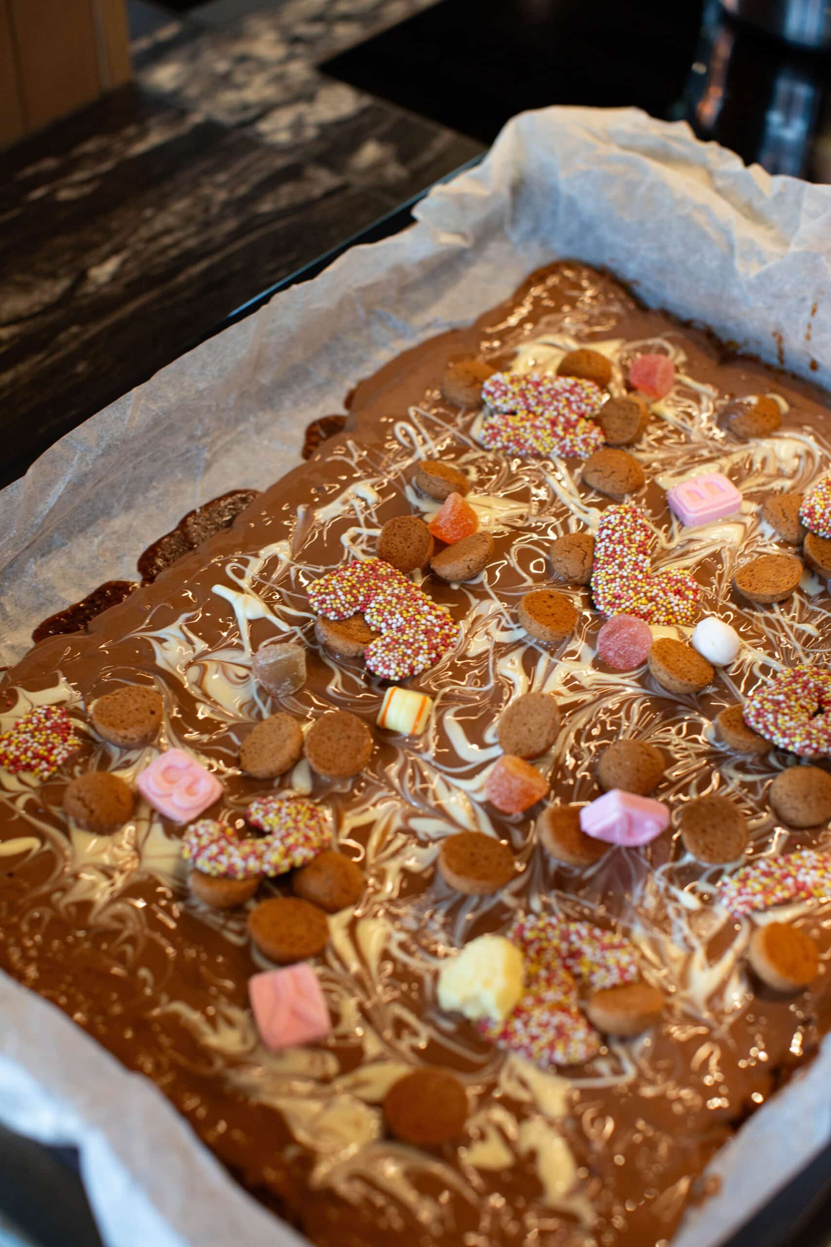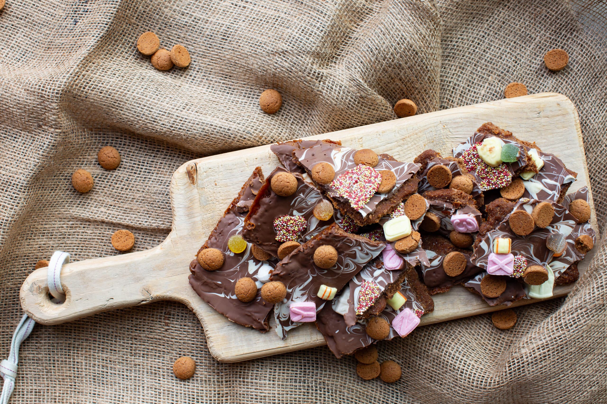 Terwijl de chocolade nog zacht is, strooi je royaal pepernoten, schuimpjes, mini chocoladeletters en ander Sinterklaassnoep over de plaat. Zet de volledige plaat 1,5 tot 2 uur in de koelkast totdat de chocolade helemaal hard is. Breek voor het serveren in grove stukken.