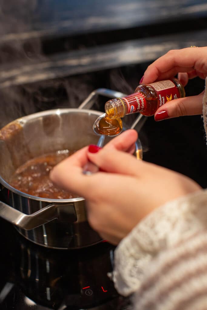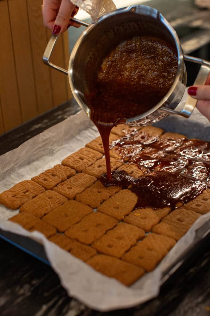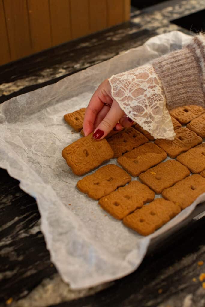 Doe de roomboter en suiker in een steelpan, laat dit smelten en voeg halverwege de vanille extract toe. Laat 2 tot 3 minuten zachtjes borrelen tot een stroperige karamel ontstaat. Bekleed een bakplaat met bakpapier en verdeel de speculaasjes erop. Giet voorzichtig de karamel over de speculaasjes. Schuif de plaat in de oven en bak af in 12 minuten op 180 graden.
