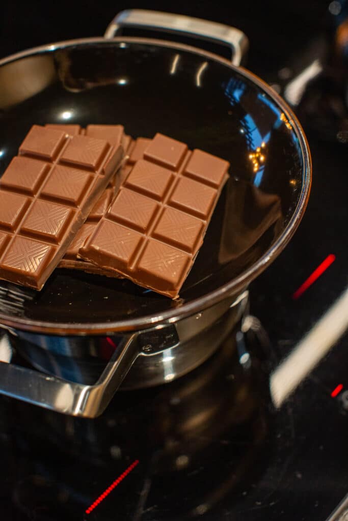 Smelt de melkchocolade en witte chocolade apart. Doe dit au bain-marie. Haal de karamelbodem uit de oven zodra deze klaar is. Laat even kort afkoelen. Giet eerst de melkchocolade over de bodem en vervolgens de witte chocolade in strepen. Maak met een satéprikker een swirlpatroon voor een marmereffect.