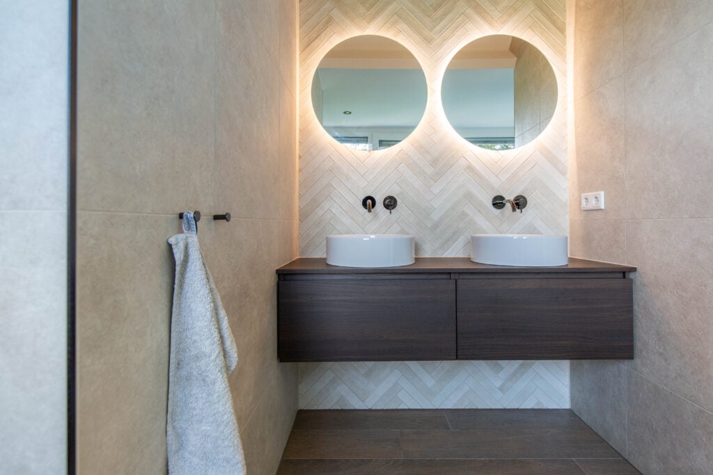 De badkamer straalt rust uit door de zachte kleuren en ronde vormen. De ronde boog bij het het bad zorgt voor een zachte, bijna mediterrane sfeer. Alle materialen zijn bewust gekozen om het simpel en kalm te houden.