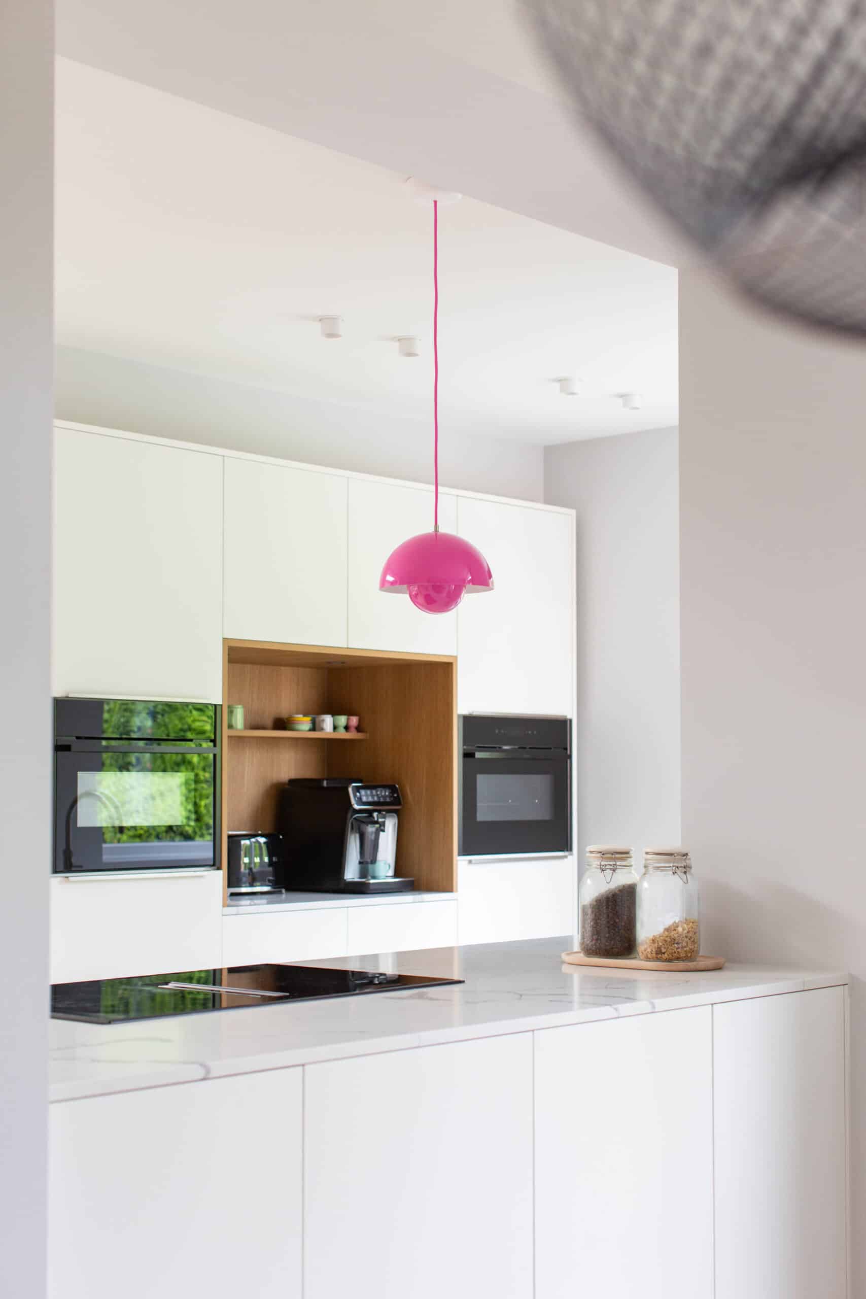 Naast alle technische keuzes zoals het rekening houden met de draagconstructies is ook over de sfeer goed nagedacht. De Rotpunkt keuken heeft strakke lijnen, waarbij de witte fronten zijn gecombineerd met een werkblad van Velthuizen Select. In de koffienis is een houttint toegepast, dit geeft precies het juiste vleugje warmte aan het ontwerp. De apparatuur is van NEFF, er is gekozen voor Flex Design in de kleur Deep Black.