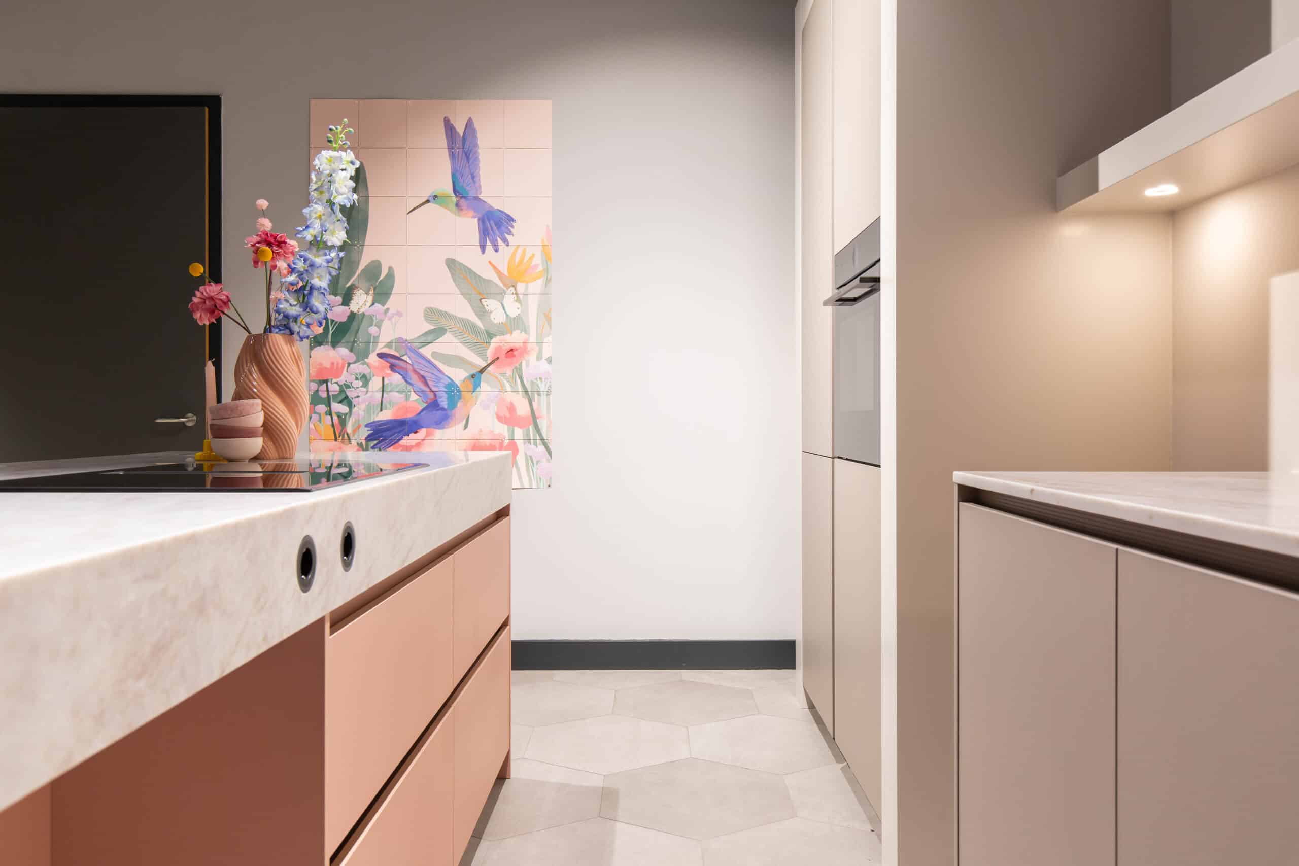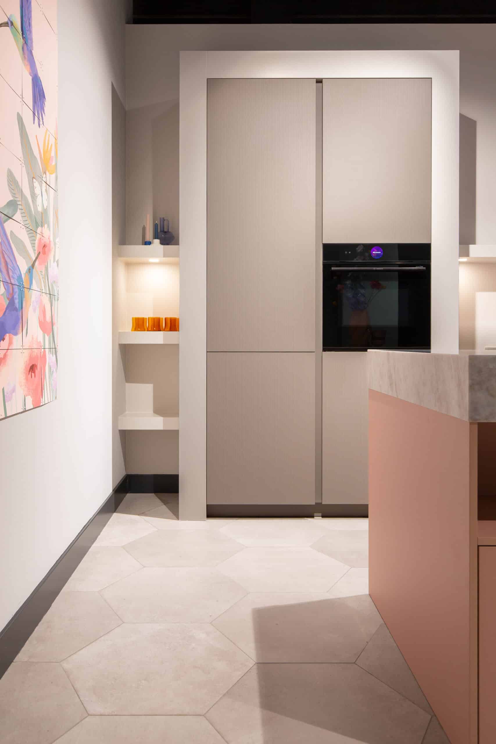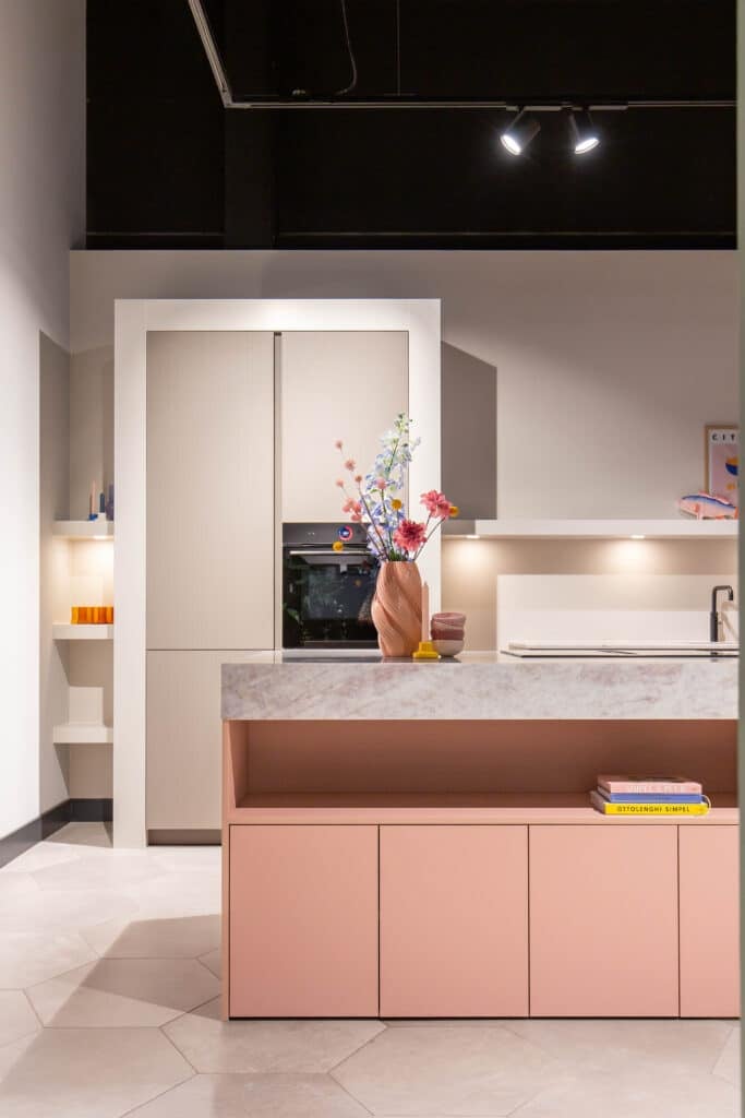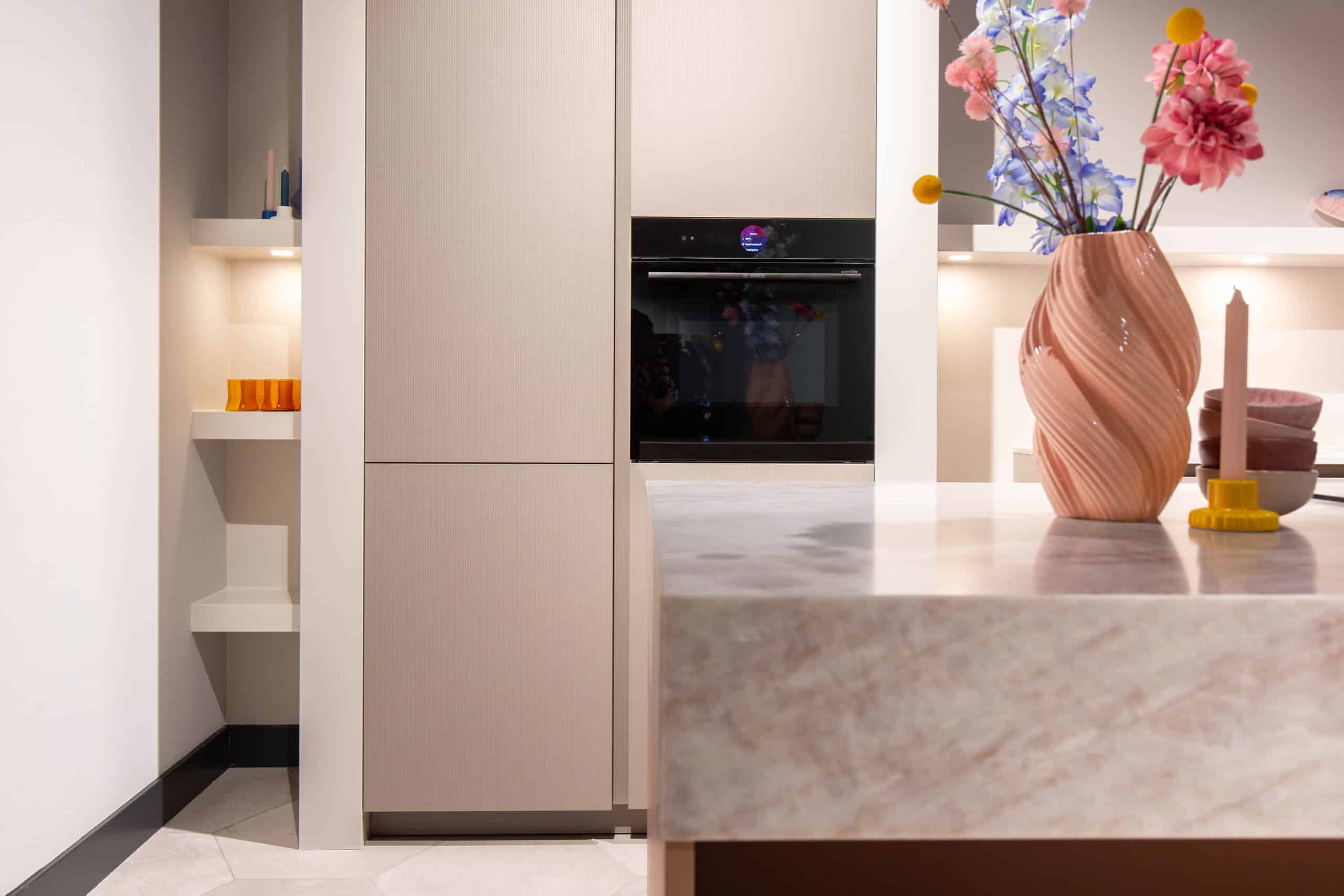 Deze keuken is compact opgesteld. Met het eiland als centraal punt en voldoende loopruimte eromheen. Het eiland heeft een zachtroze front, een perfecte combinatie met het front van de hoge kast: hier is gekozen voor een front met subtiele ribbel in een prachtige kiezelkleur. Deze poedertinten vormen samen met het quartz werkblad een rustige basis.