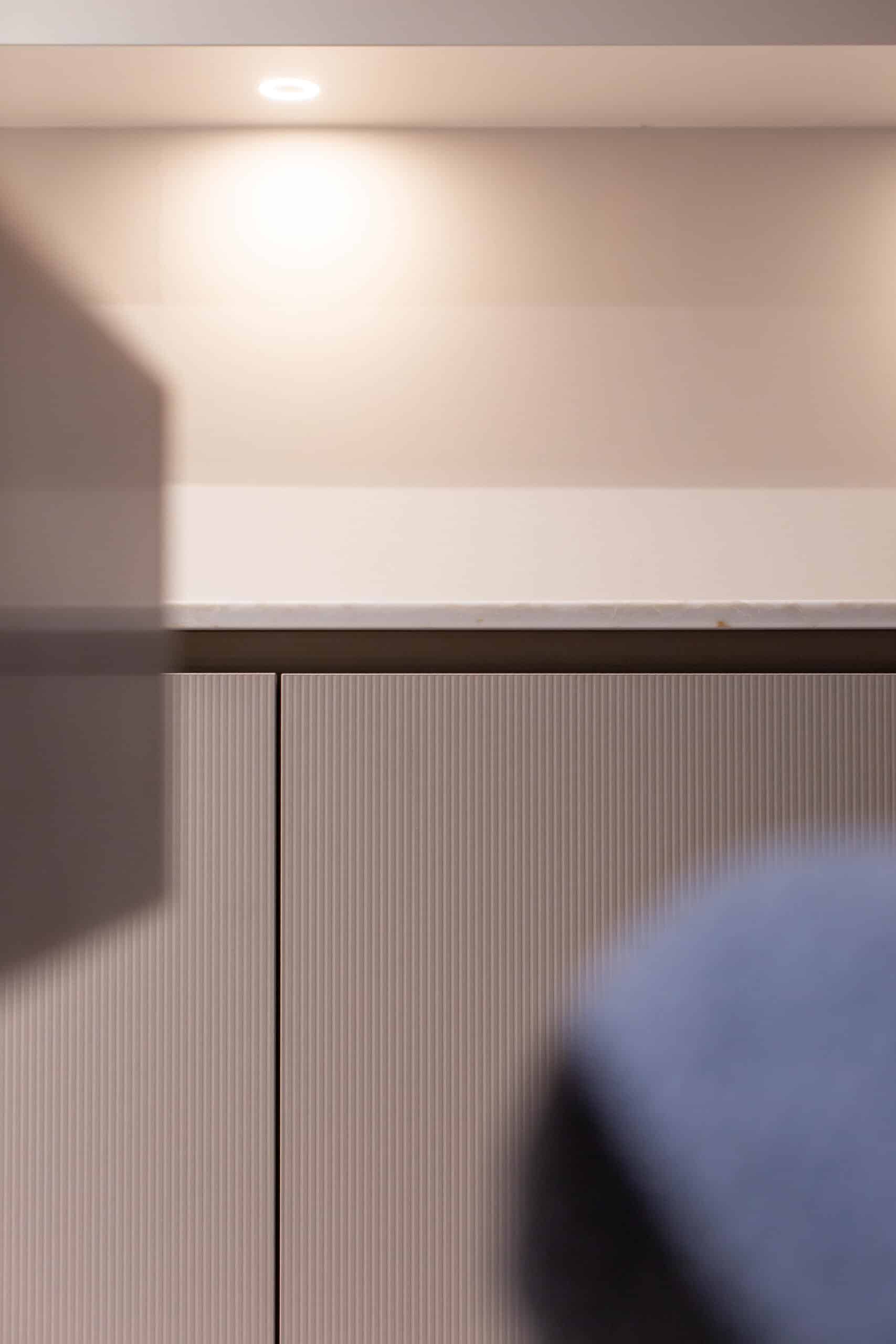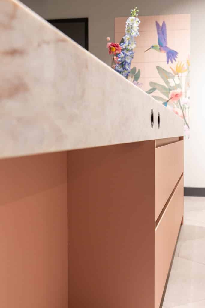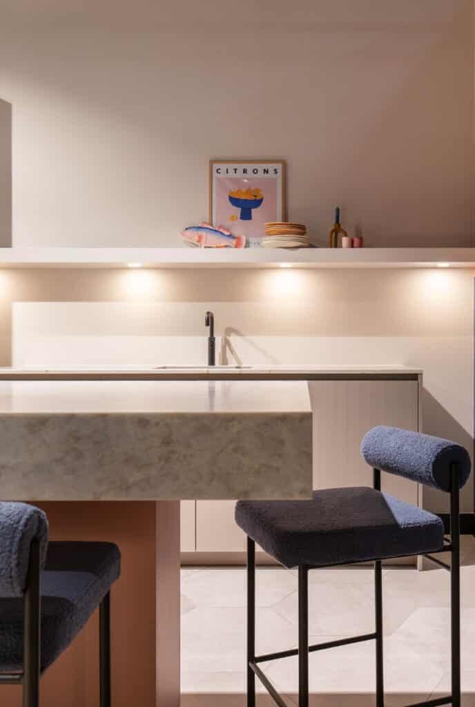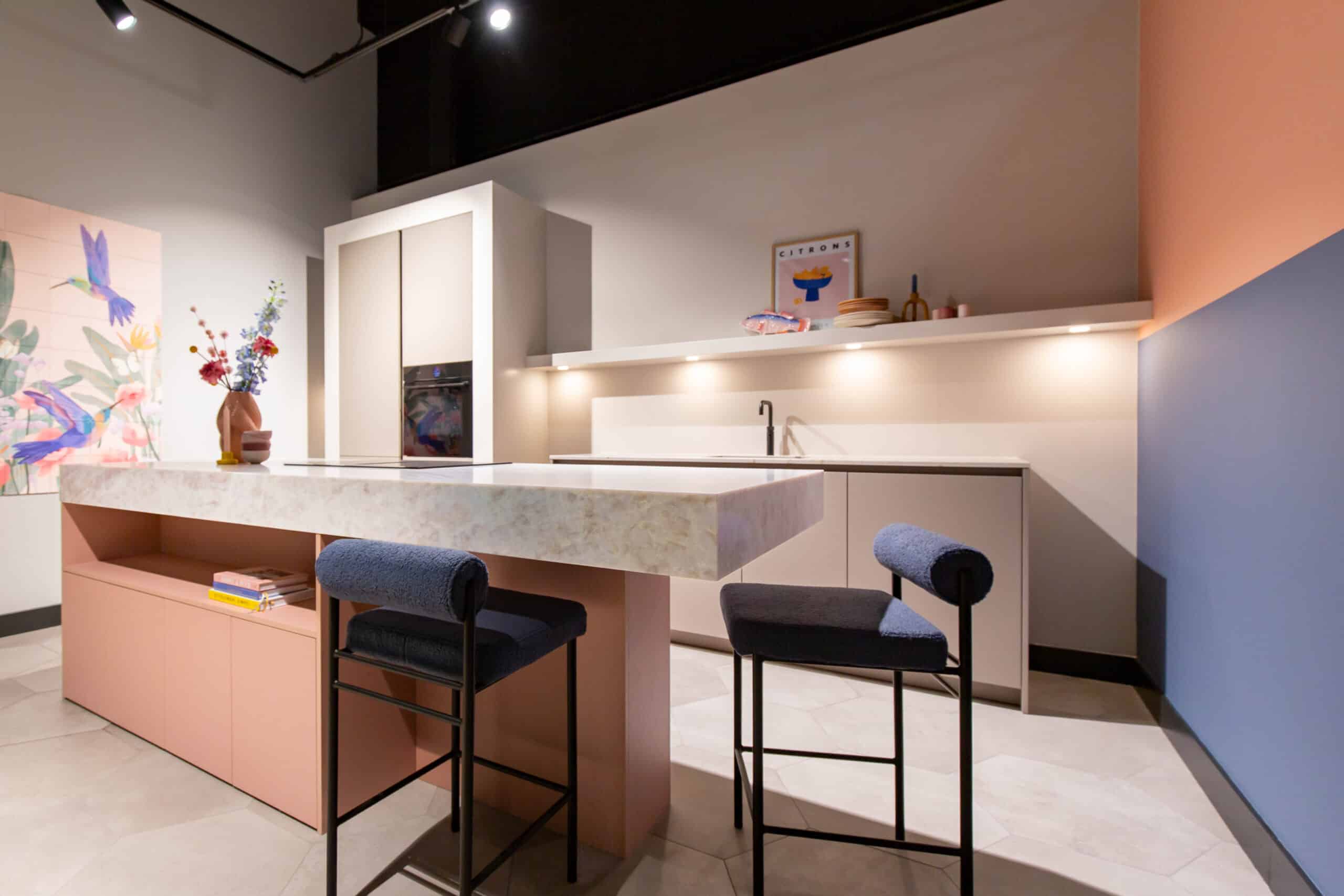 Deze keuken is compact opgesteld. Met het eiland als centraal punt en voldoende loopruimte eromheen. Het eiland heeft een zachtroze front, een perfecte combinatie met het front van de hoge kast: hier is gekozen voor een front met subtiele ribbel in een prachtige kiezelkleur. Deze poedertinten vormen samen met het quartz werkblad een rustige basis.