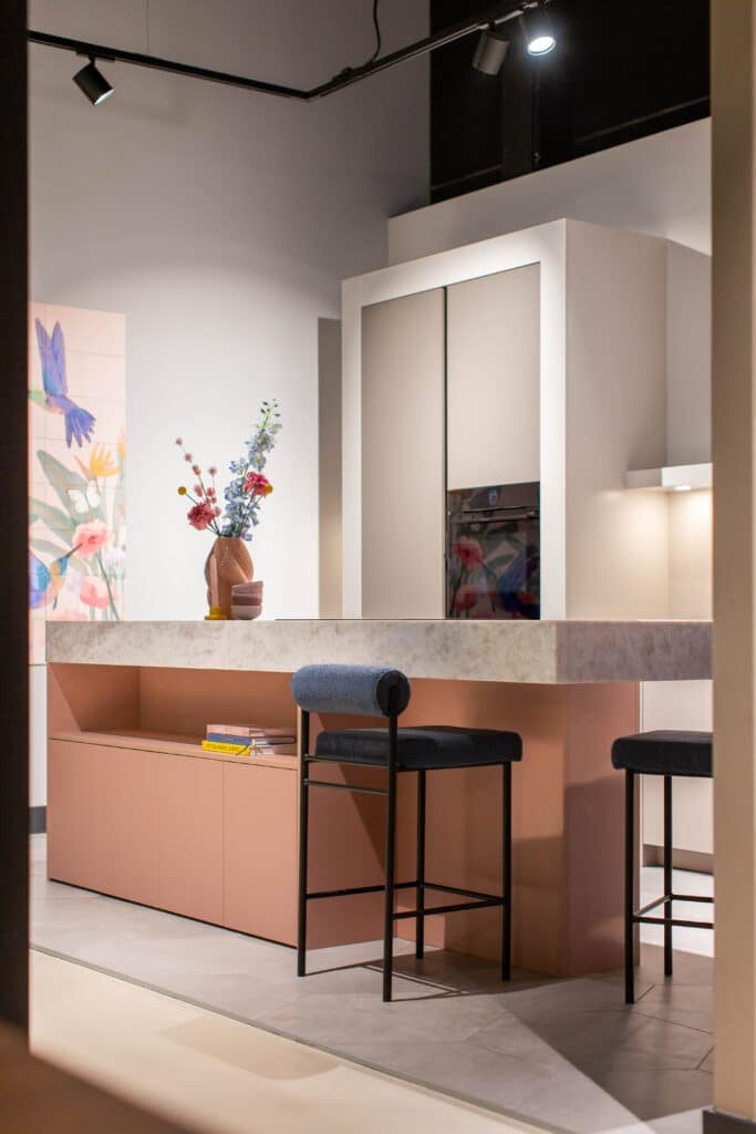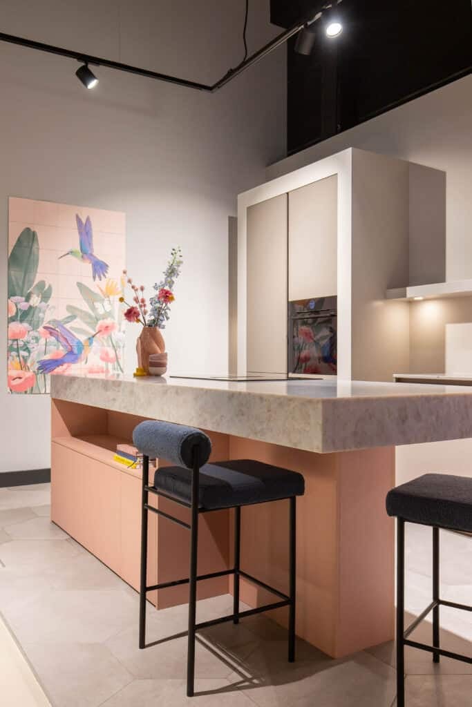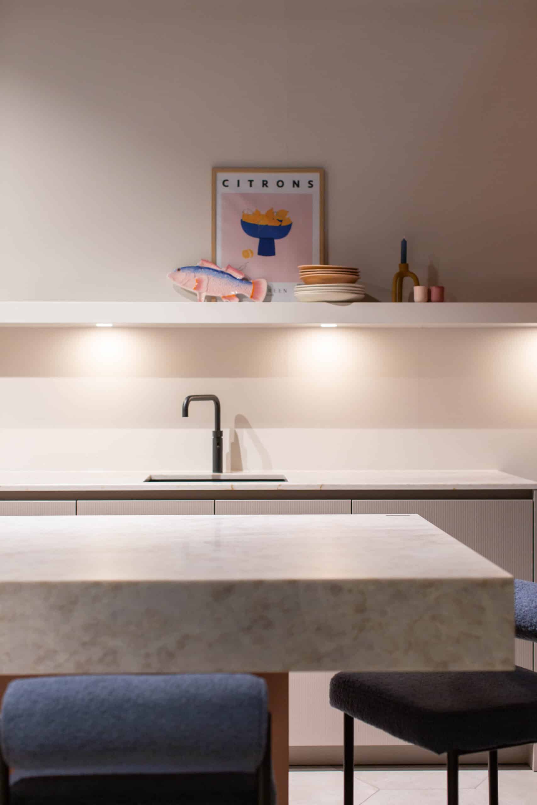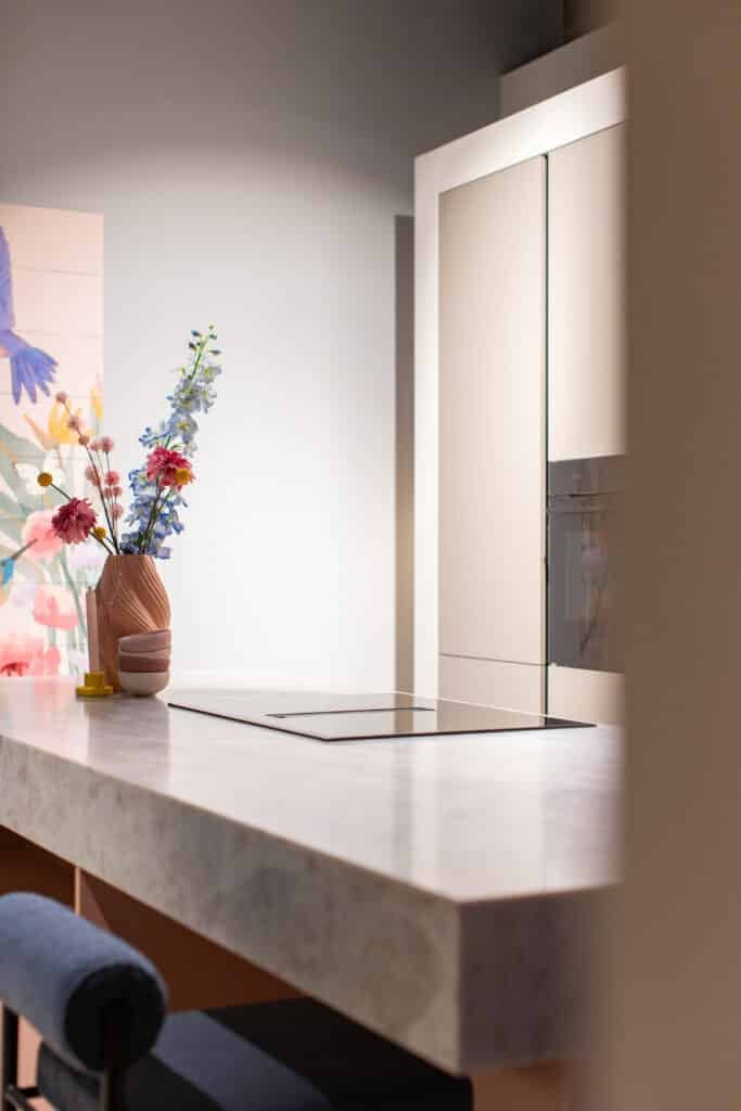 Bij het samenstellen van deze showroomkeuken van Madebydas hebben we gekozen voor materialen waar je in het dagelijks gebruik blij van wordt. Het quartz werkblad van Velthuizen Select heeft een mooie, genuanceerde structuur die je blijft bekijken, én het is onderhoudsvriendelijk.