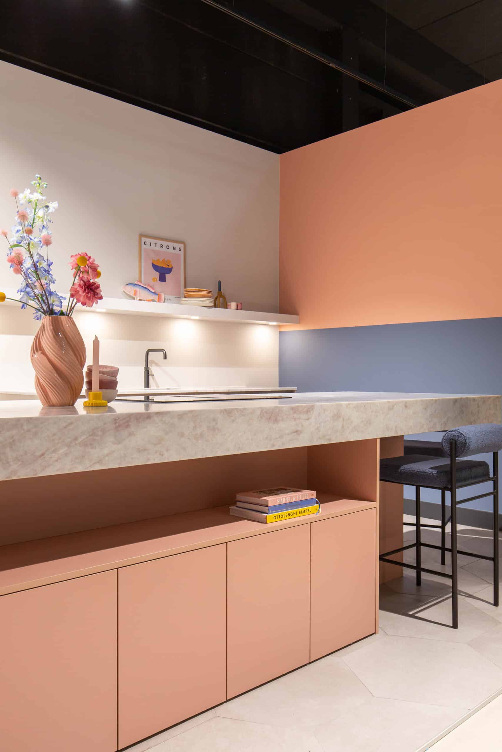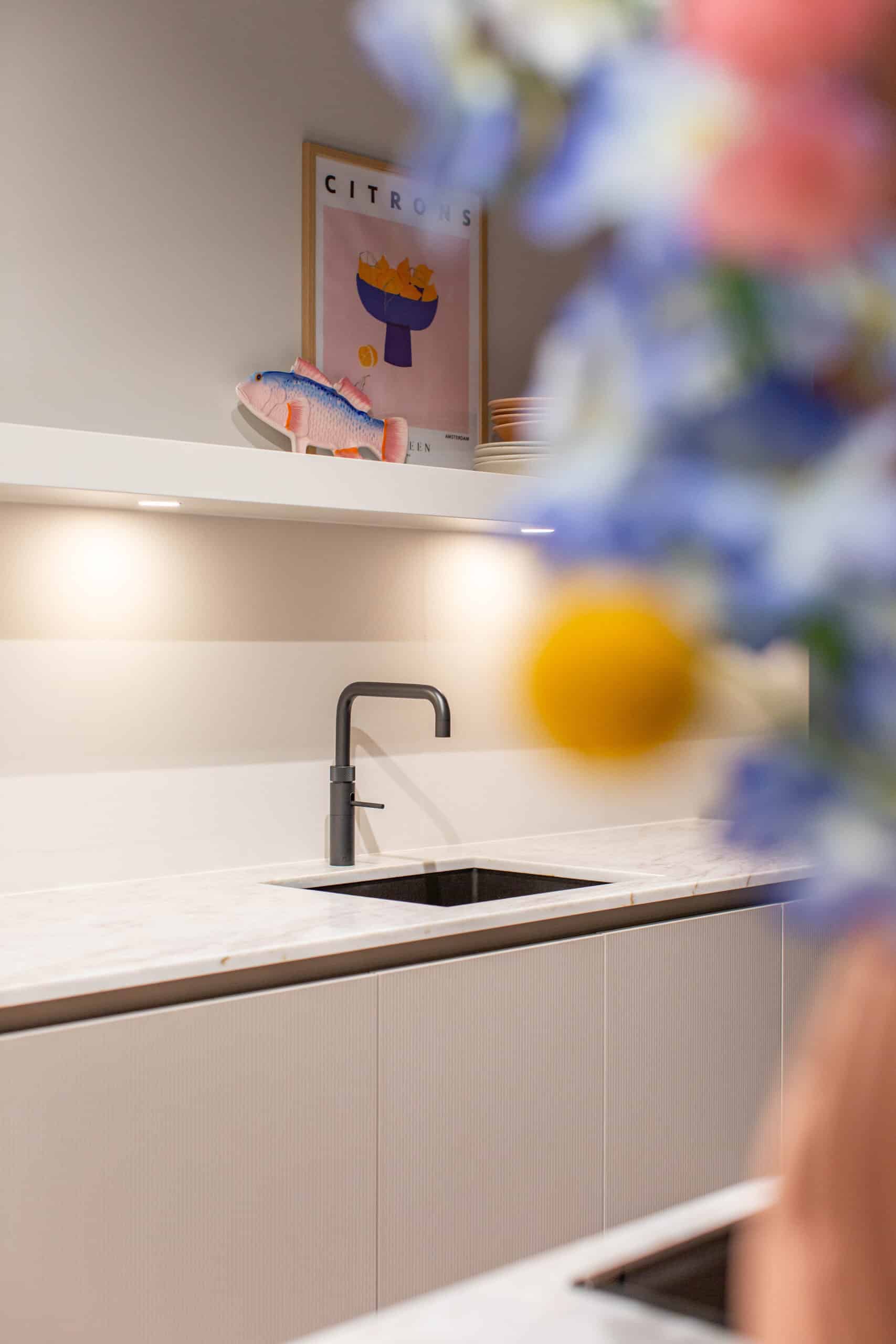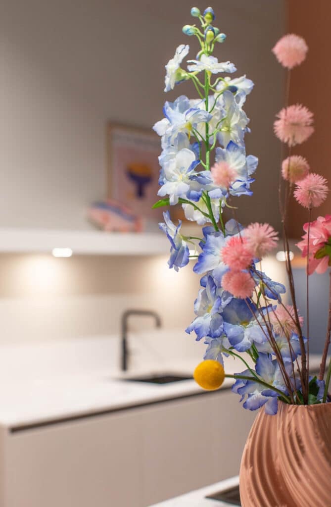 Bij het samenstellen van deze showroomkeuken van Madebydas hebben we gekozen voor materialen waar je in het dagelijks gebruik blij van wordt. Het quartz werkblad van Velthuizen Select heeft een mooie, genuanceerde structuur die je blijft bekijken, én het is onderhoudsvriendelijk.