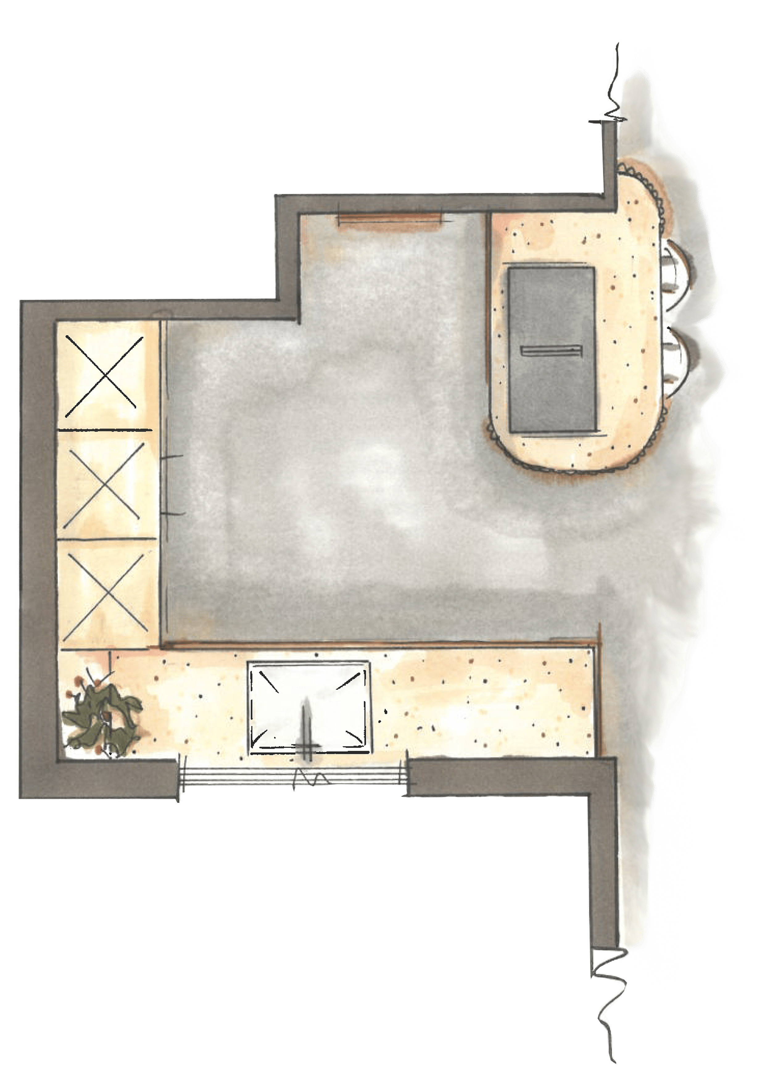 Het kookeiland is een echte eyecatcher: half rond van vorm en bekleed met leer van Alphenberg, wat helemaal past binnen de trend van zachte, afgeronde vormen. Het werkblad van Dekker is gemaakt van composiet in een terrazzo-look, en loopt sierlijk mee in de ronde vormen van het eiland. De afwerking is tot in detail doorgevoerd: zowel de Quooker als de spoelbak zijn uitgevoerd in gun metal. Alle apparatuur is van Pelgrim, met onder andere een fantastische matzwarte inductiekookplaat voorzien van bladafzuiging.