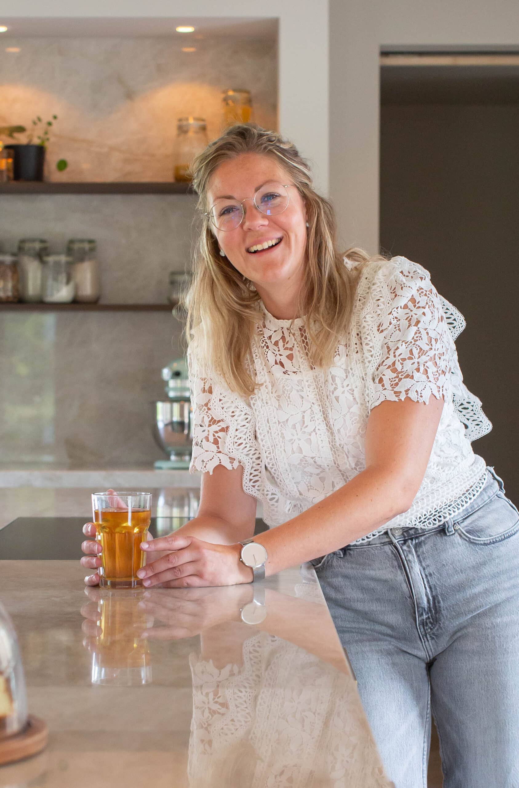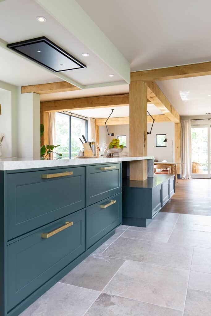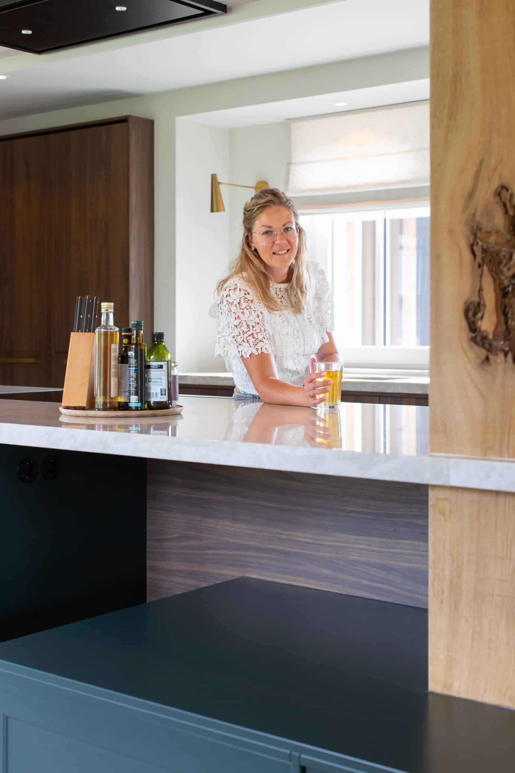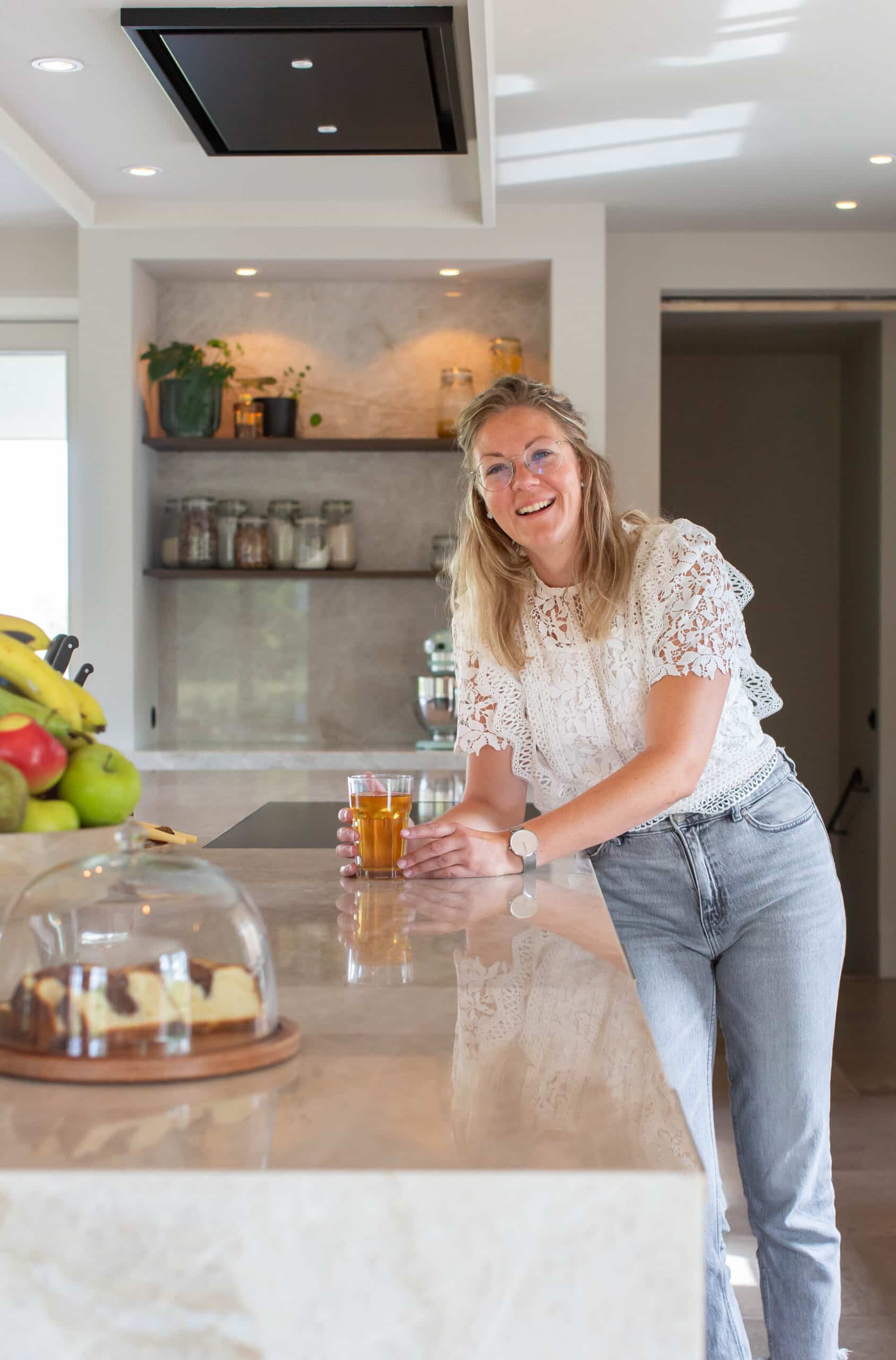 In deze keuken van Madebydas draait alles om balans en verbinding. De speelse verspringing bij het eiland geeft een verbinding tussen de keuken en het eetgedeelte. Het werkblad van Velthuizen Select speelt hierbij een belangrijke rol. De keuze voor het werkblad was niet snel gemaakt. “We zijn naar de showroom van de leverancier geweest, en toen ik ons blad zag wist ik het meteen”, vertelt Paula. “Toch blijft het spannend omdat het echt natuursteen is en het dus nog wel iets anders uit kan pakken. Maar gelukkig is het precies zo geworden als waar wij van droomden.”