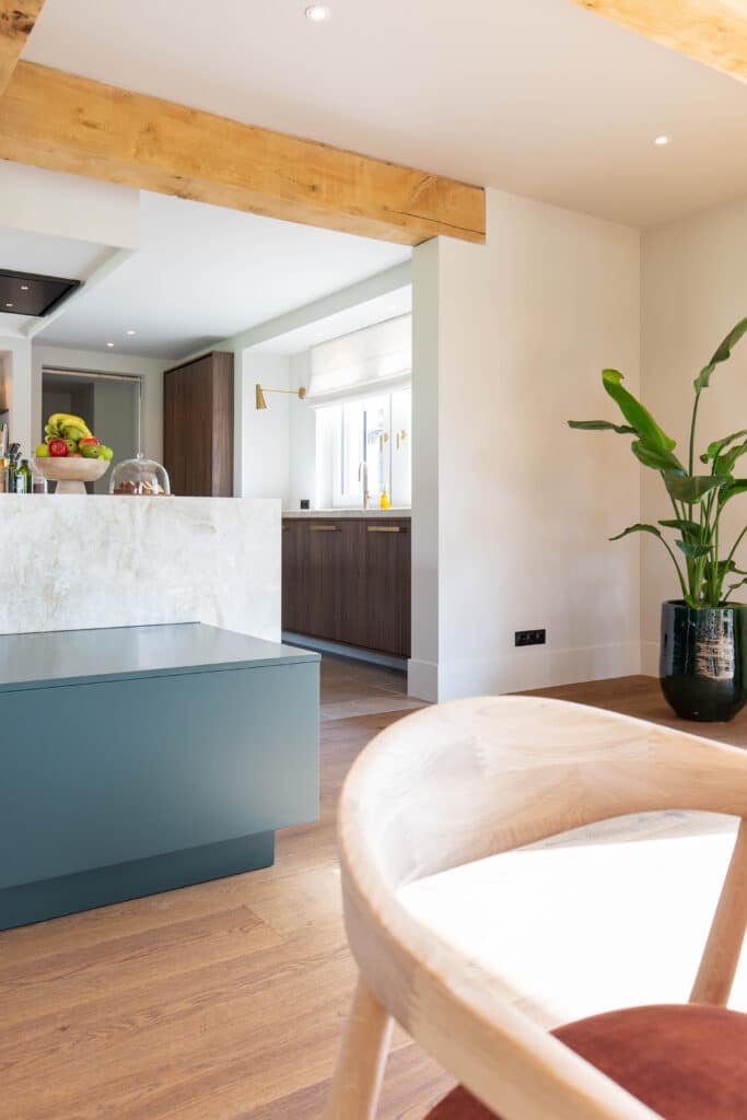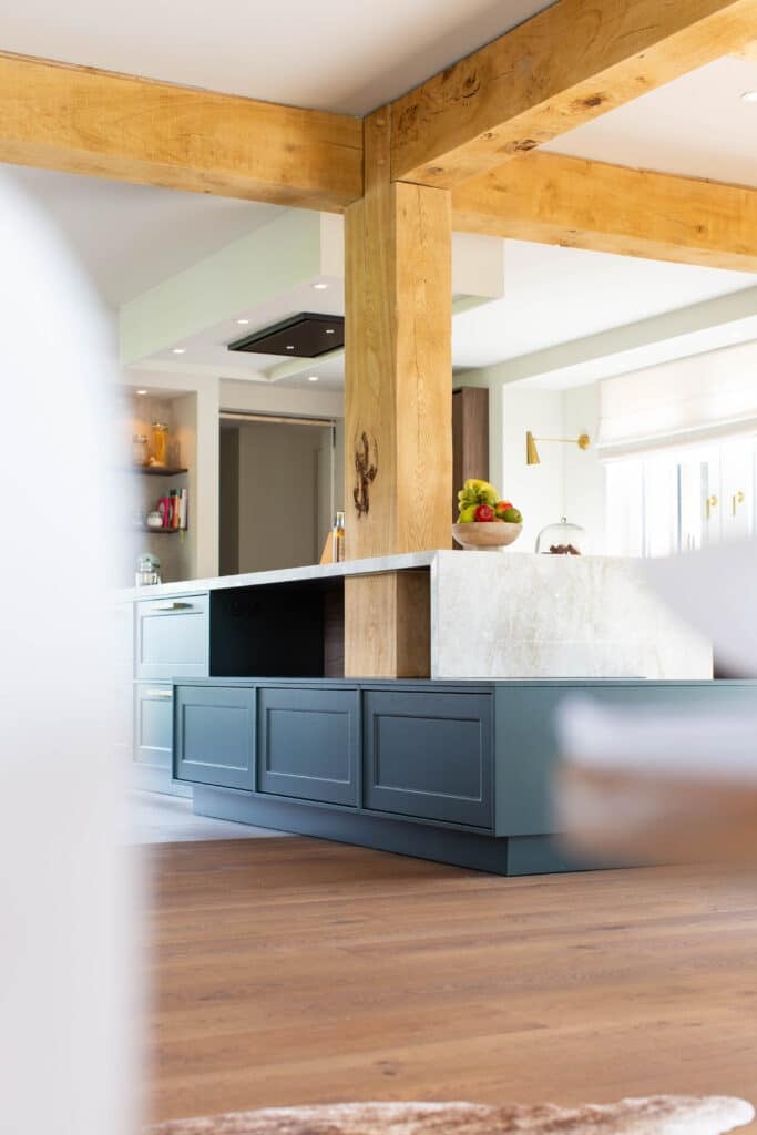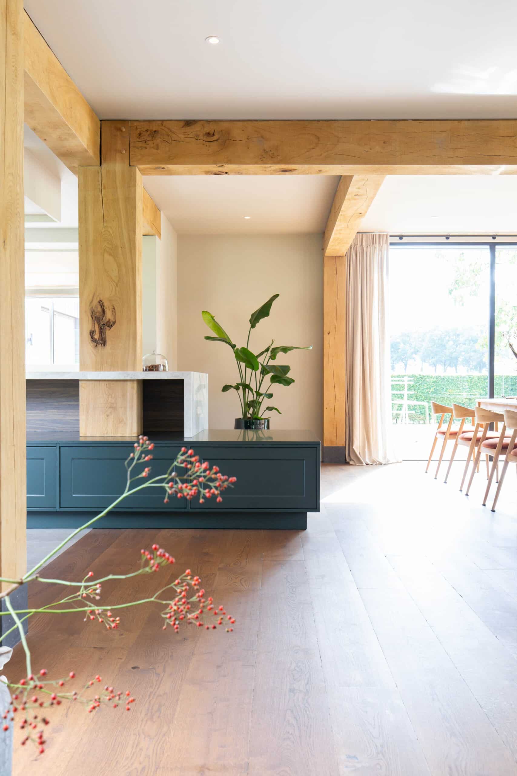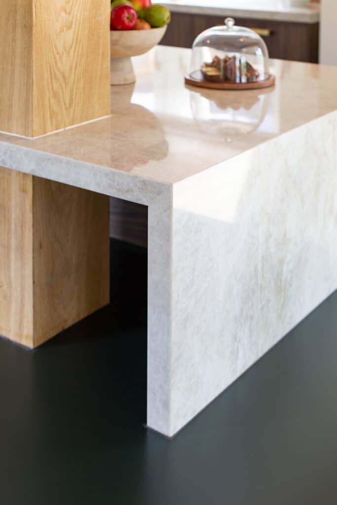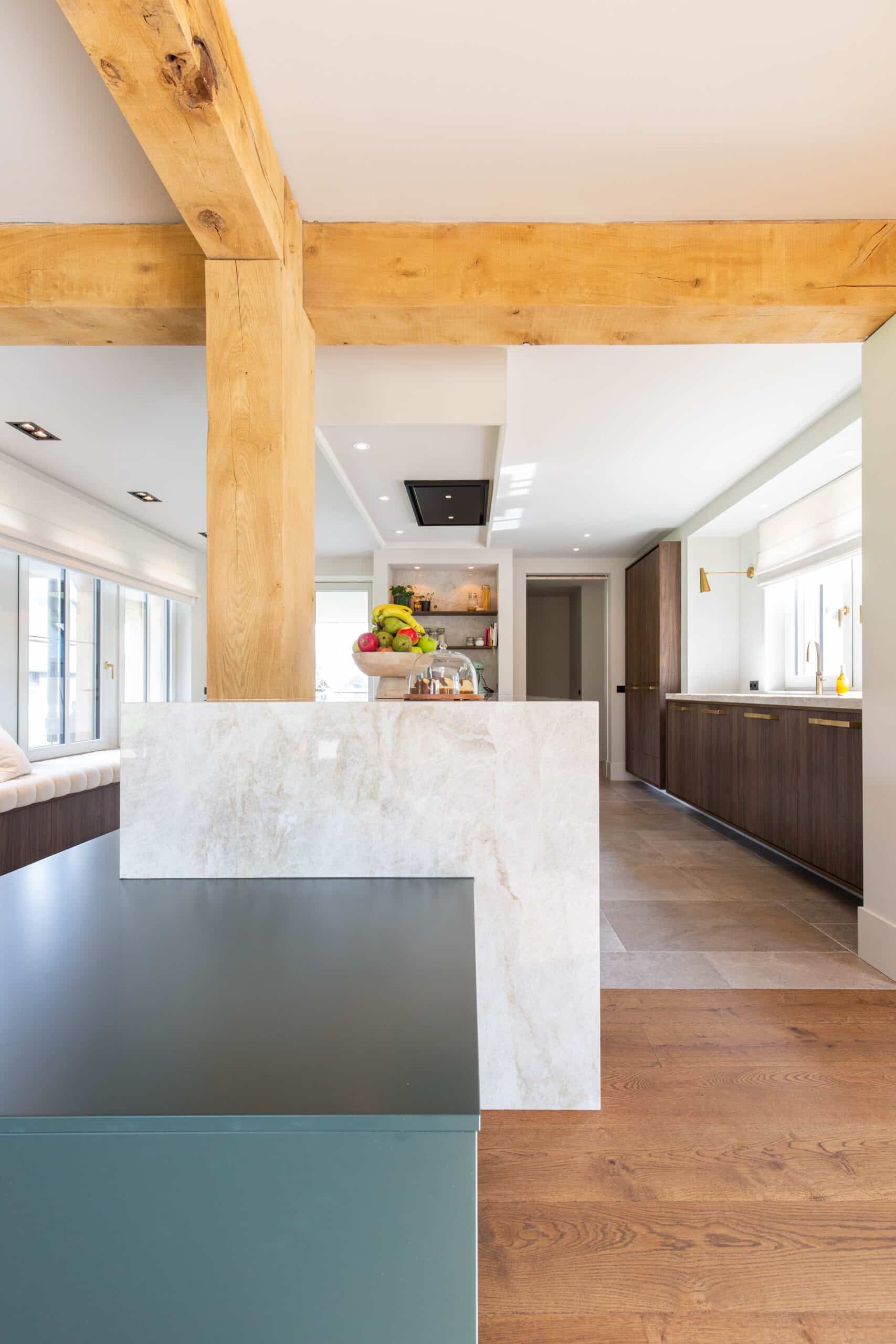 In deze keuken van Madebydas draait alles om balans en verbinding. De speelse verspringing bij het eiland geeft een verbinding tussen de keuken en het eetgedeelte. Het werkblad van Velthuizen Select speelt hierbij een belangrijke rol. De keuze voor het werkblad was niet snel gemaakt. “We zijn naar de showroom van de leverancier geweest, en toen ik ons blad zag wist ik het meteen”, vertelt Paula. “Toch blijft het spannend omdat het echt natuursteen is en het dus nog wel iets anders uit kan pakken. Maar gelukkig is het precies zo geworden als waar wij van droomden.”