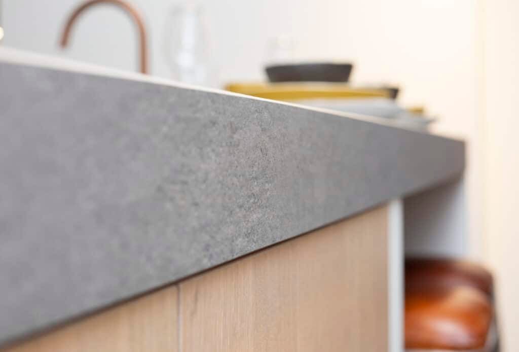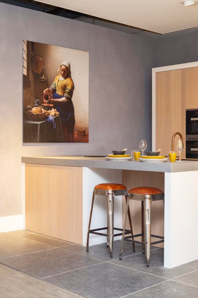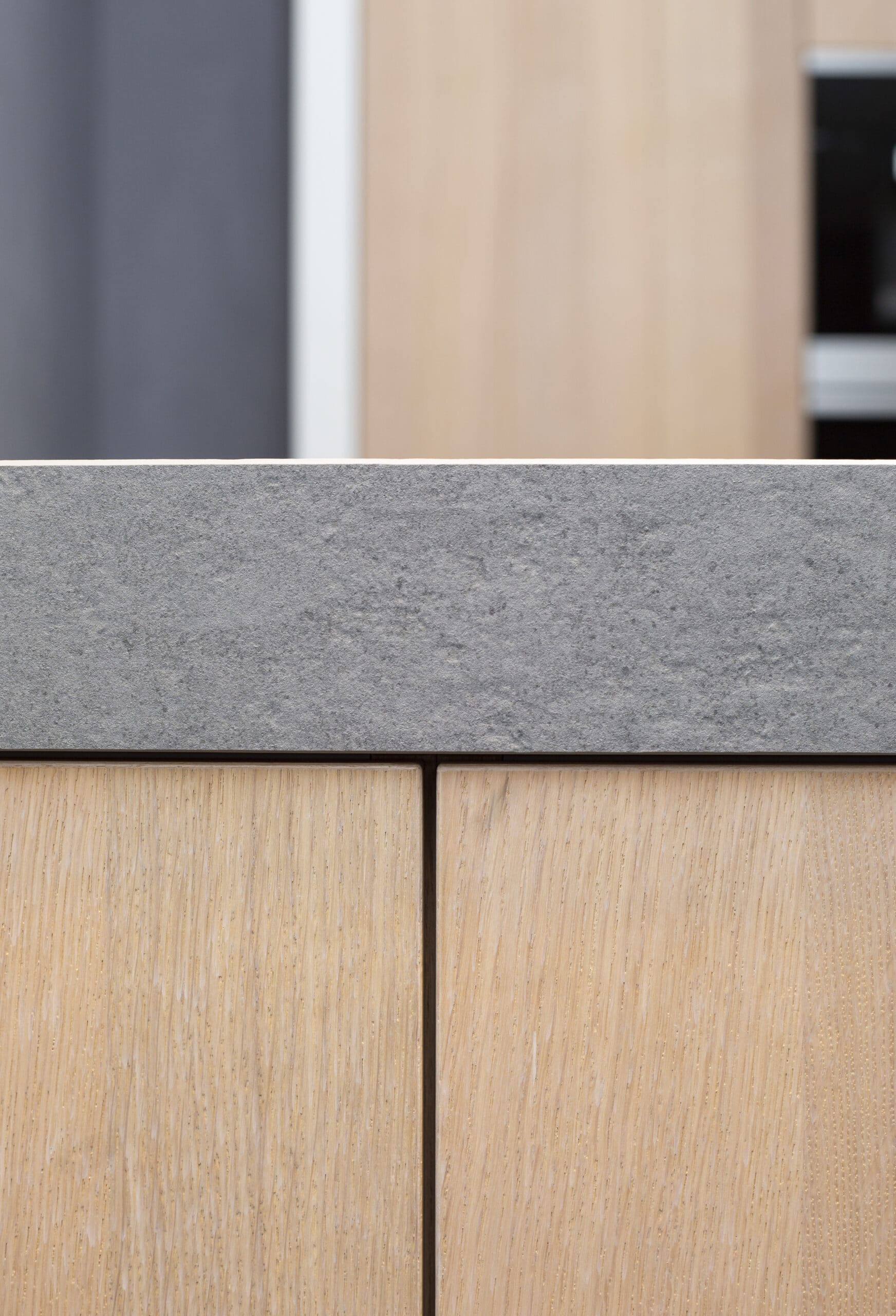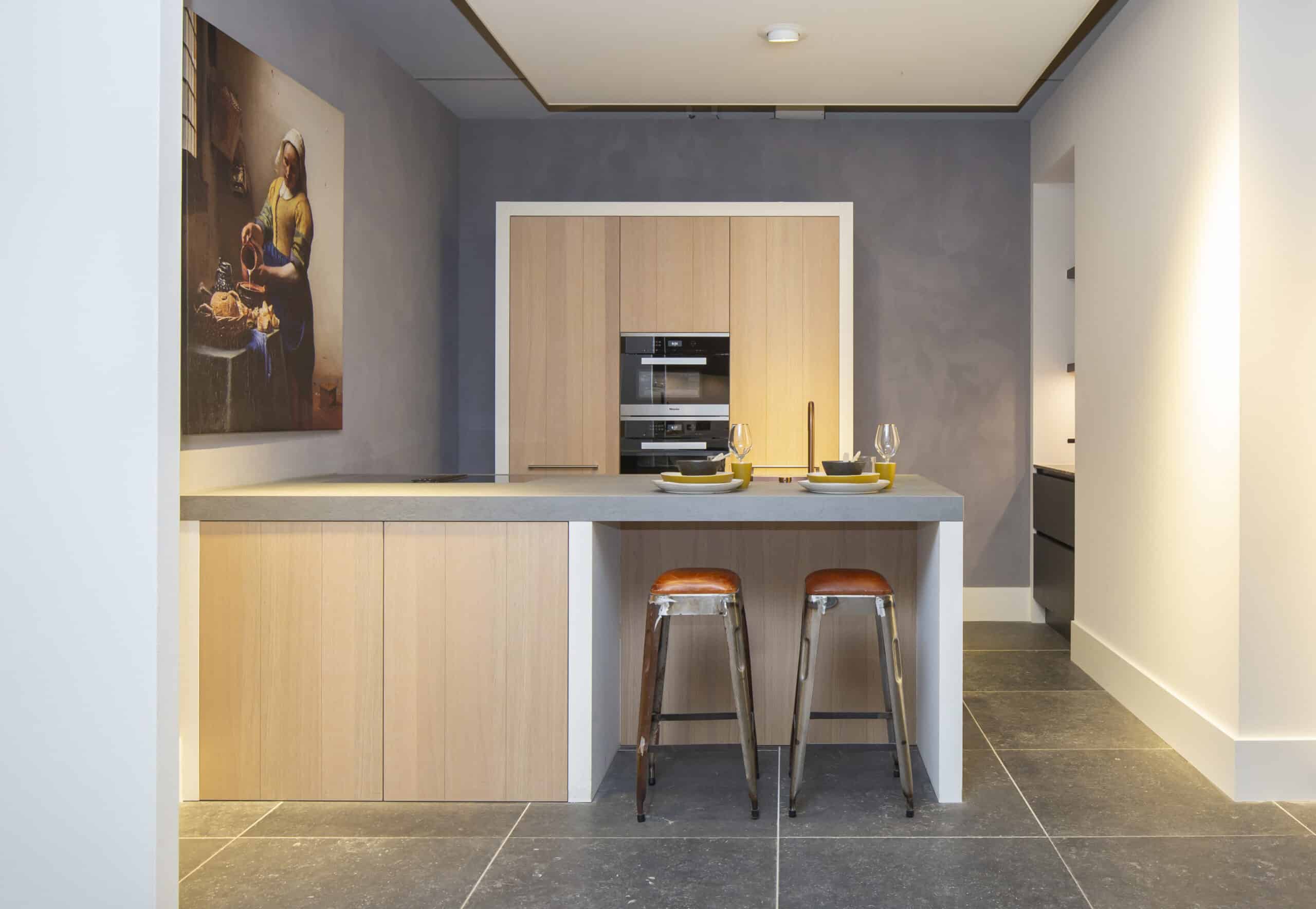 Deze eilandkeuken met fronten van eikenfineer is echt een blikvanger in onze showroom. De vrijstaande kastenwand, met daarin onder andere een combi-stoomoven en een royale koel-vriescombinatie van Miele, heeft een ombouw van royale stollen. Het werkblad is van keramiek, maar heeft de uitstraling van beton. Zo heb je wel de look, maar niet de (negatieve) eigenschappen van beton. Keramiek is daarentegen kras- en hittebestendig, ideaal dus!