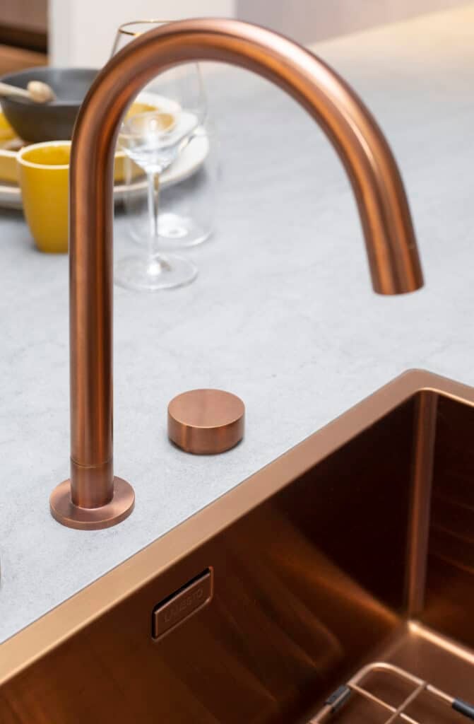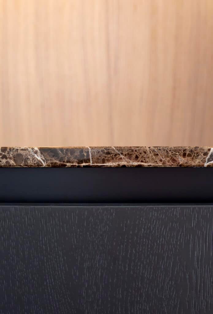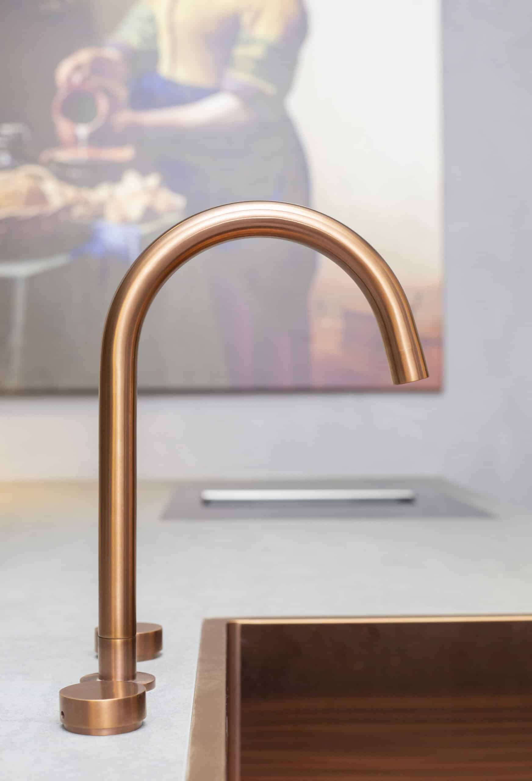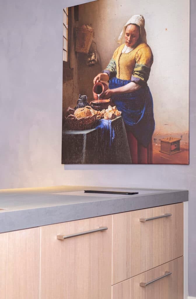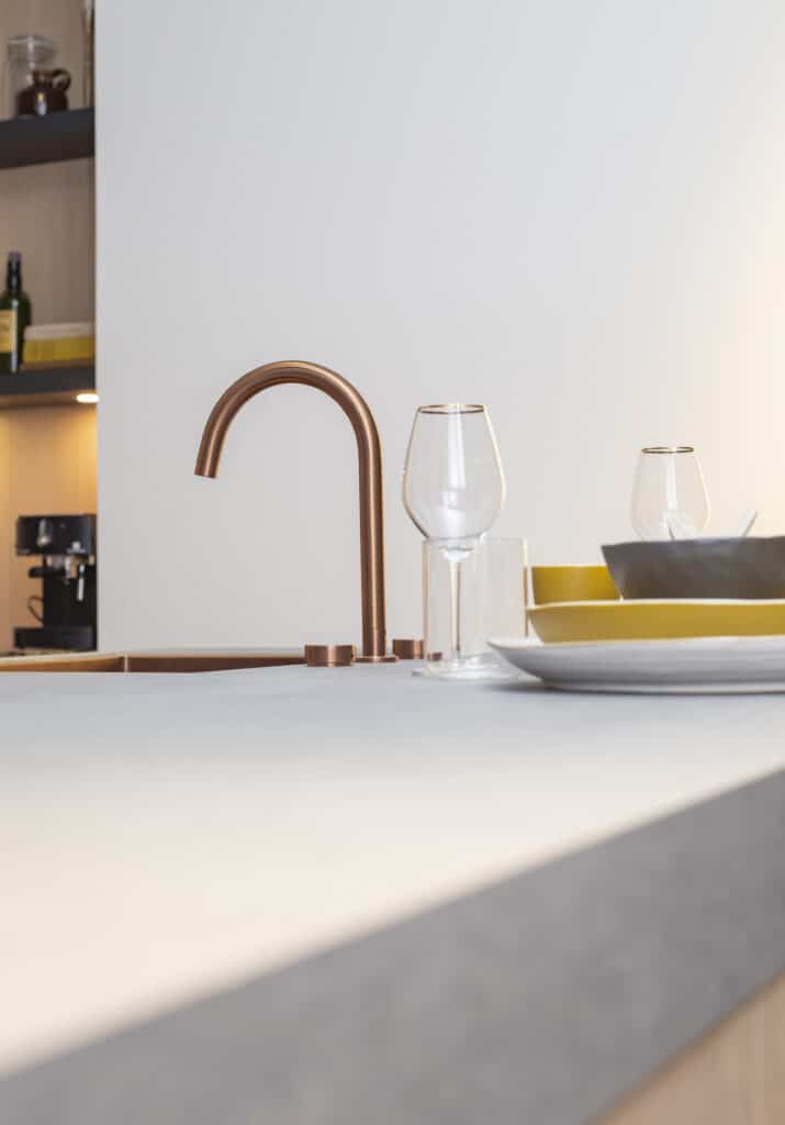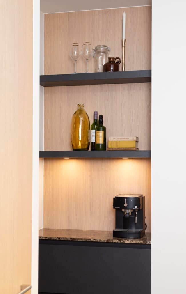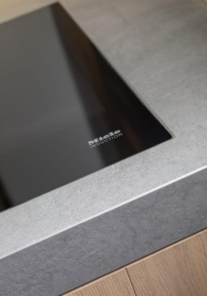 Het kookeiland is niet groot, maar wel voorzien van zowel een inductiekookplaat als een spoelbak met kraan. De kookplaat van Miele beschikt over geïntegreerde afzuiging, zo combineer je dus twee apparaten! In de hoek van de keuken is een aparte koffiecorner gecreëerd met ruime lades voor het servies. Hier is niet veel ruimte voor nodig; een echte aanrader dus!