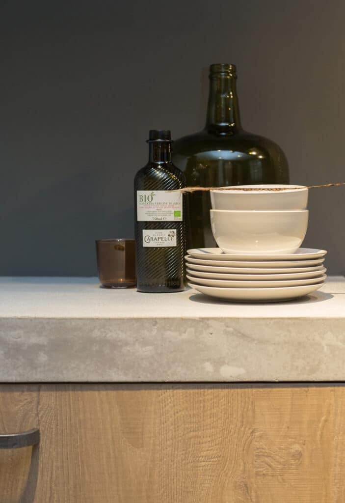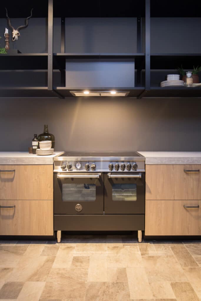 Deze industriële, robuuste keuken met betonnen werkblad van maar liefst acht centimeter dik heeft fronten uitgevoerd in de kleur Sherwood Bronx. De houtlook van deze fronten doet het ontzettend goed met de robuuste afwerking van het werkblad. Daar begint het industriële tintje. Het frame boven het kookgedeelte met daarin de afzuiging verwerkt onderstreept dit industriële gevoel nog eens! Deze keuken heeft een vrijstaand fornuis van Bertazzoni, de kookplaat heeft een inductiekookveld met vijf verschillende verwarmingszones. De handgrepen komen uit onze eigen Velthuizen Select-collectie.