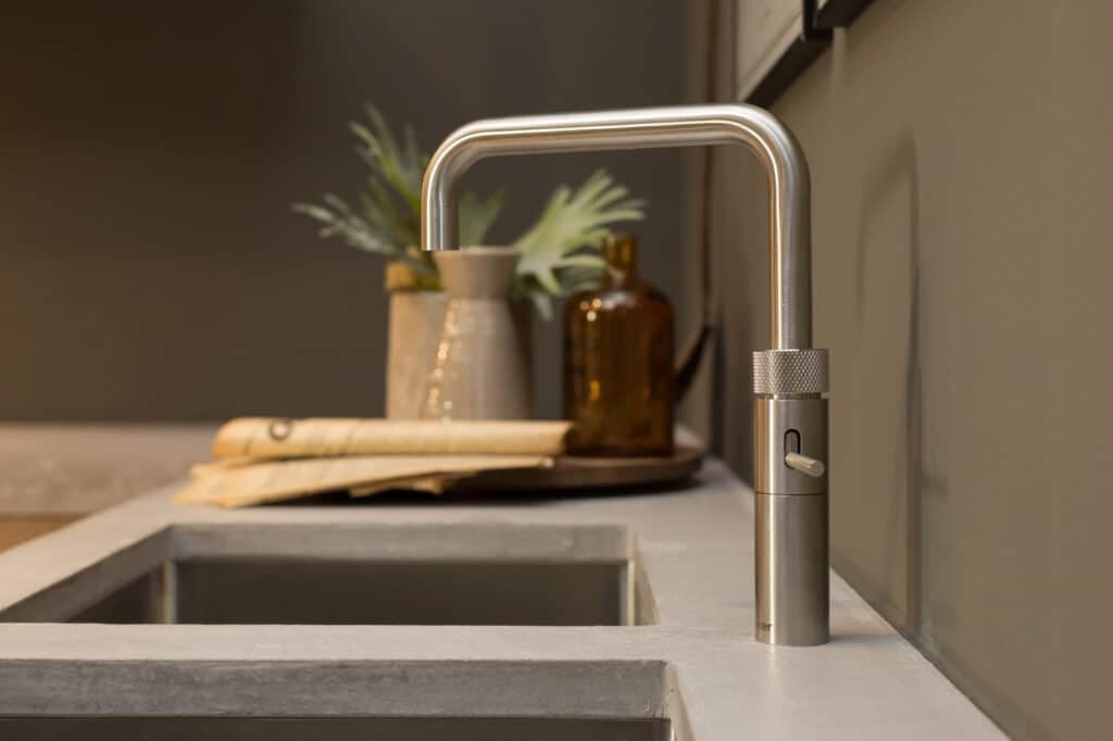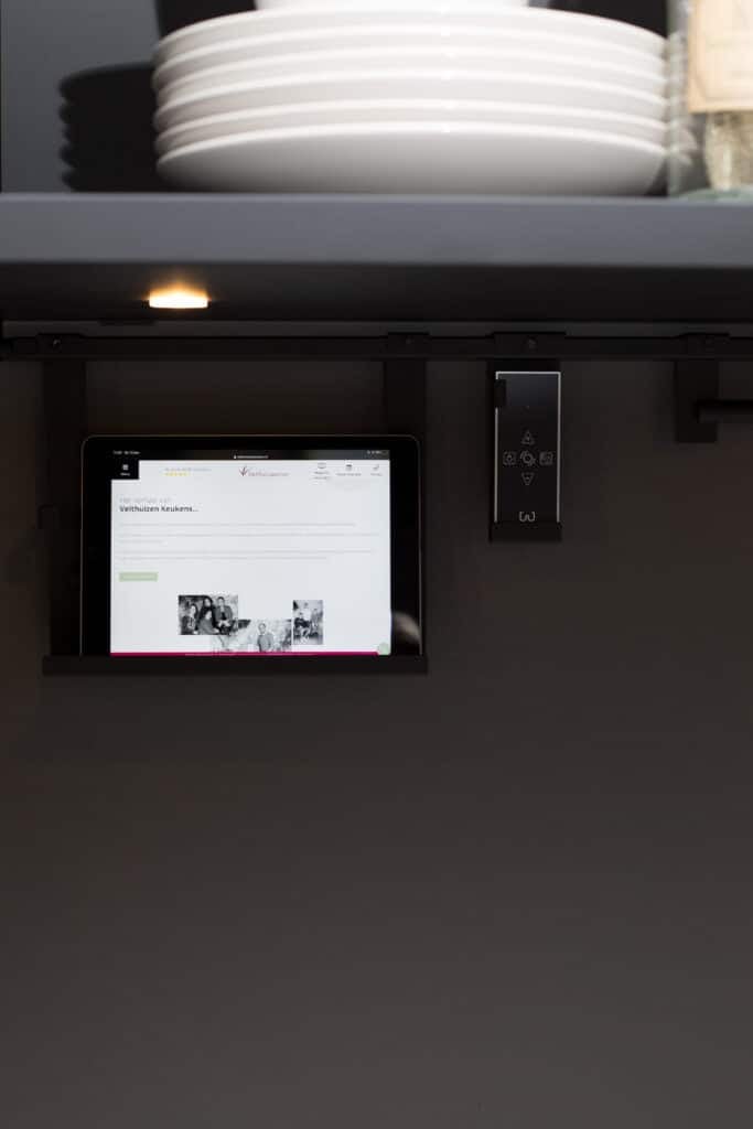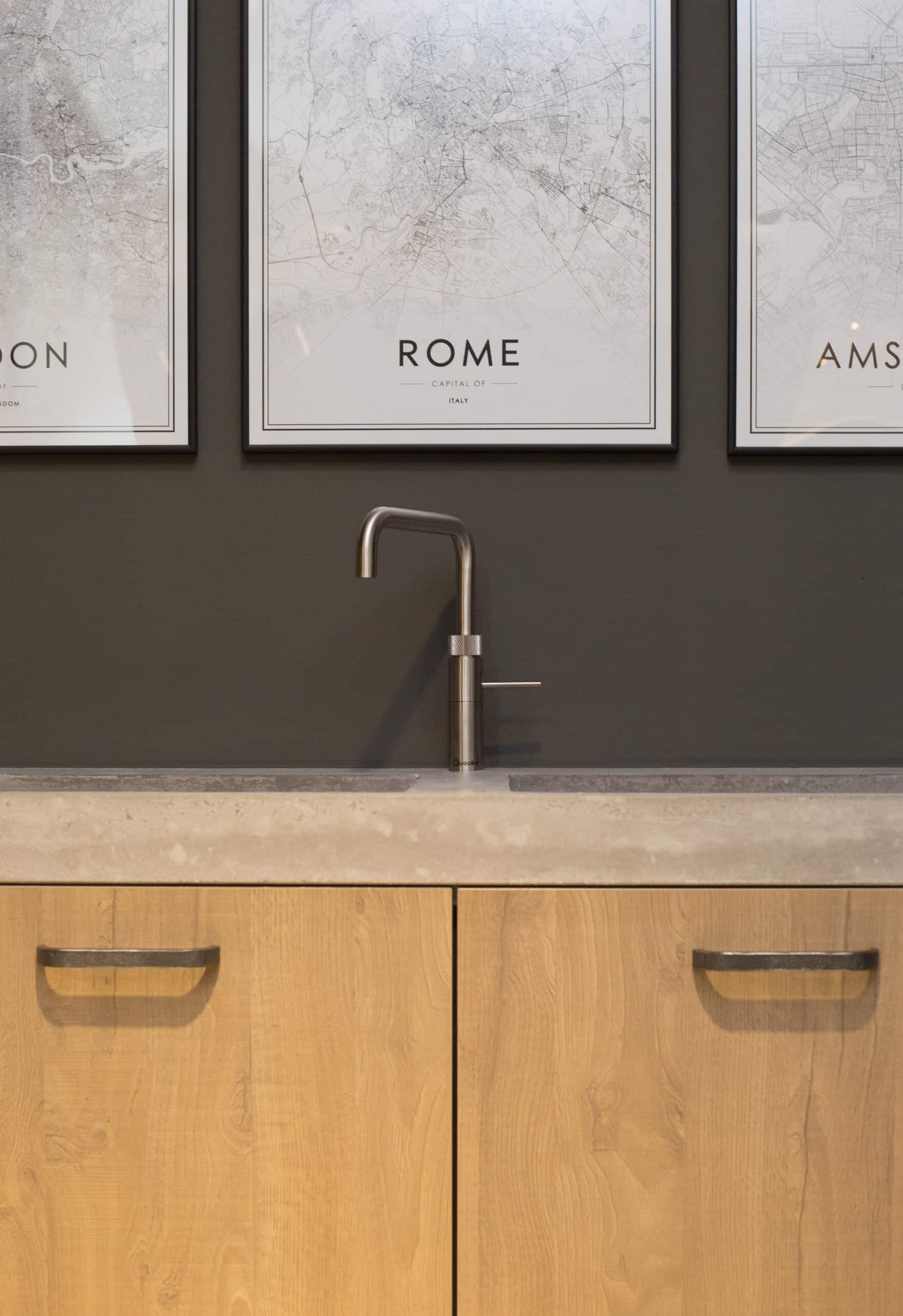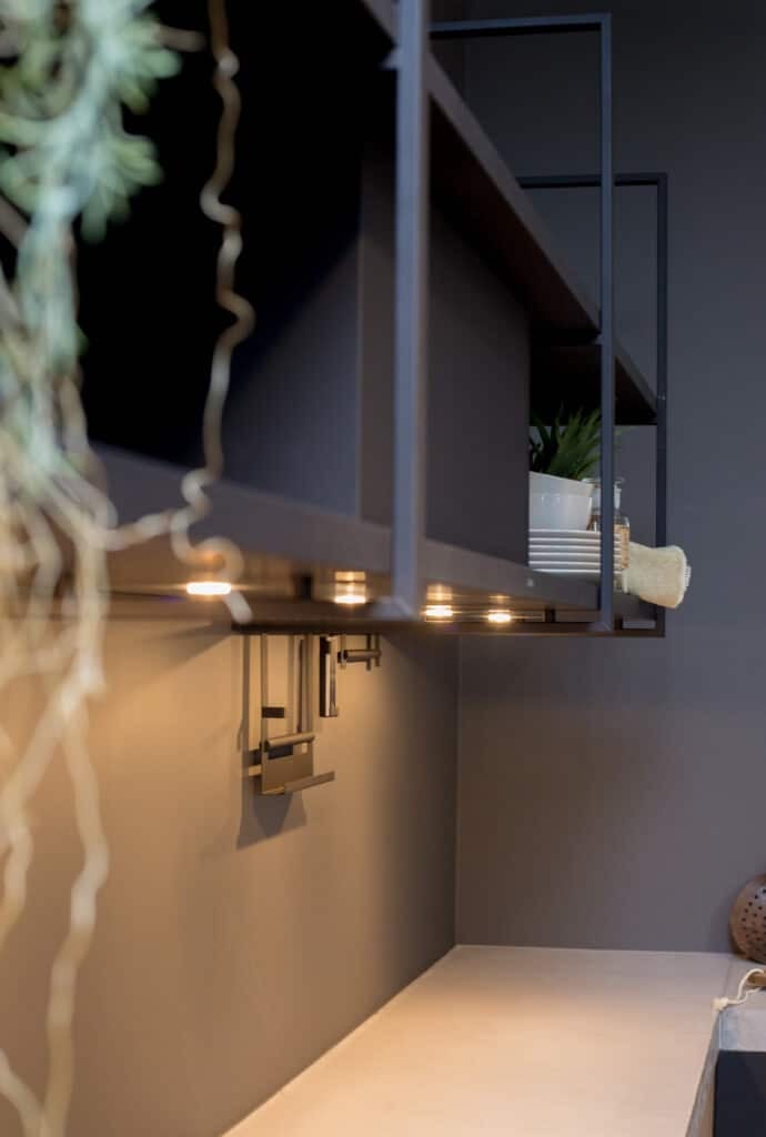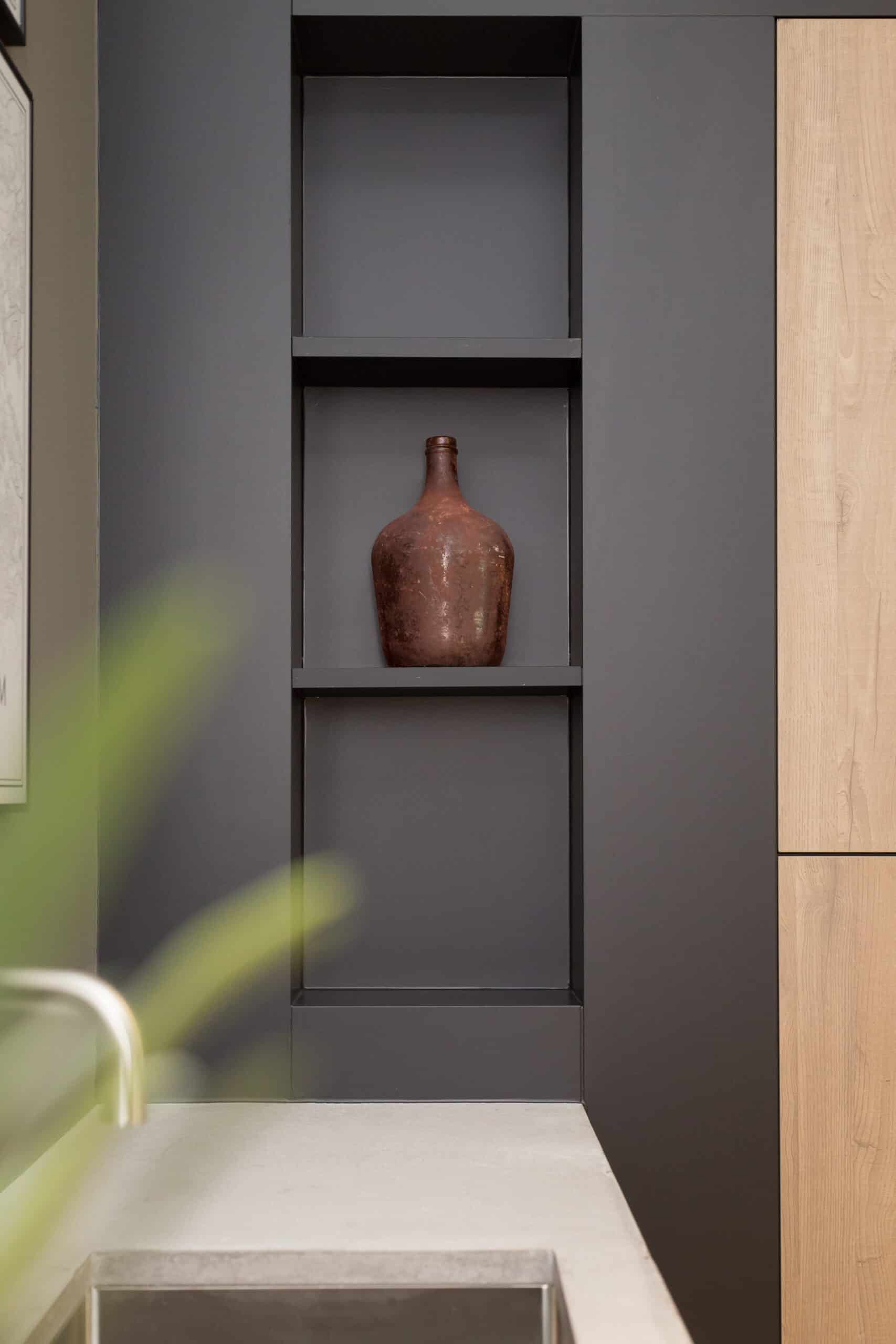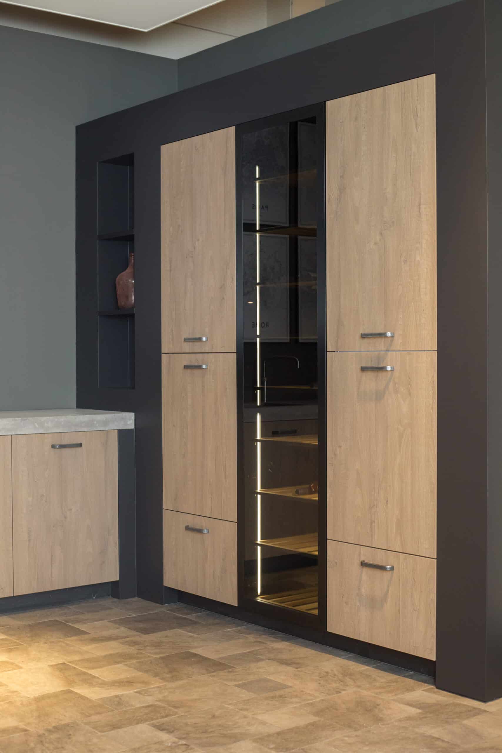 De hoge kastenwand zorgt voor veel bergruimte. Tussen de twee kasten in is een wijnkast gecreëerd. Deze kast koelt de wijn niet, maar is wel een heel sfeervolle kast voor je mooie wijncollectie. De stollen in deze industriële keuken zijn in dit geval donker geschilderd. Deze stollen zijn in elke kleur te schilderen, stel je voor dat je bijvoorbeeld voor een lichte kleur zou kiezen… Met een kleine ingreep heb je dan direct een heel andere uitstraling van de keuken!